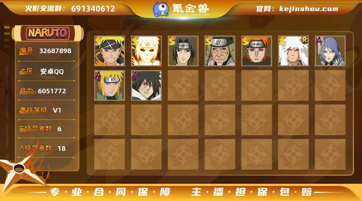 【V1 6S忍 18A忍 110忍 16通灵】605万战力 佩恩·天道,漩涡鸣人·宇智波佐助,猿飞日斩·秽土转生,波风水门·九喇嘛连结,宇智波鼬·须佐能乎,自来也·舞之豪杰 挂凌工作青 df18-11,编号:WPCGA07