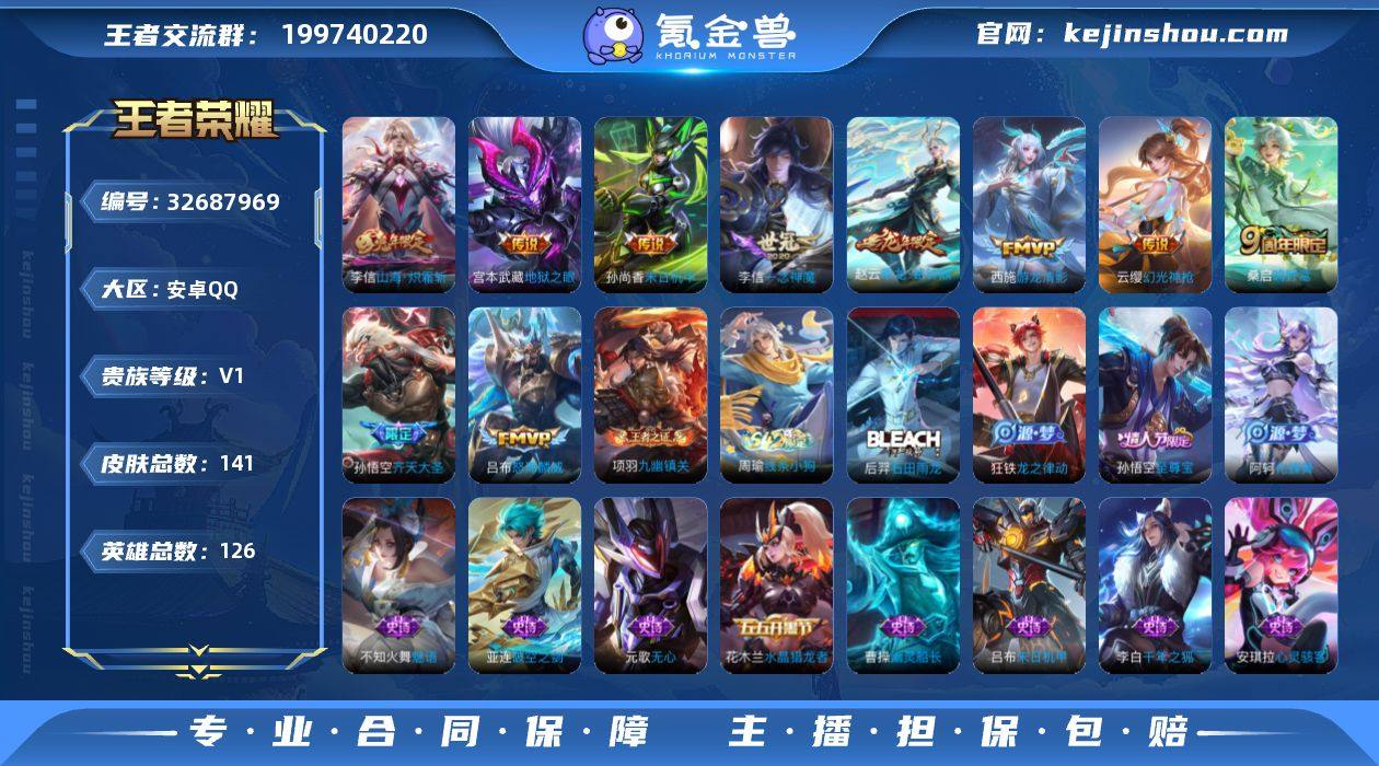 安卓Q-V0-至尊星耀III段位-126英雄-141皮肤-10传说-36史诗 【英雄全皮】:敖隐全皮 【传说皮肤】:云缨幻光神枪,桑启鸣野蒿,赵云乘龙铭钟鼎,孙悟空齐天大圣,李信山海炽霜斩,吕布怒海麟威,西施游龙清影,李信一念神魔,孙尚香末日机甲,宫本武藏地狱之眼 【限定皮肤】:蒙犽顽岩魄,姜子牙天穹之誓,狄仁杰阴阳师,赵云皇家上将,孙尚香蔷薇恋人,元歌无心,狄仁杰魔术师,狄仁杰万华元夜,达摩沙漠行僧,项羽海滩派对,孙悟空至尊宝,孙悟空齐天大圣,李元芳云中旅人,钟馗驱傩正仪,鬼谷子原初探秘者,沈梦溪大漠名商,裴擒虎擒涛扼浪,李信山海炽霜斩,鲁班大师探海日志,桑启海盐诗旅,张良古海寻踪,蒙恬荣光圣徽,鬼谷子天穹祈灯,赵云乘龙铭钟鼎,沈梦溪龙舞盛年,刘邦剑破天穹,周瑜熔金海岸 【年限皮肤】:李信山海炽霜斩,赵云乘龙铭钟鼎 【赛季限定】:鬼谷子原初探秘者,狄仁杰万华元夜,钟馗驱傩正仪,达摩沙漠行僧,沈梦溪大漠名商,李元芳云中旅人,桑启海盐诗旅,裴擒虎擒涛扼浪,鲁班大师探海日志,张良古海寻踪,鬼谷子天穹祈灯,刘邦剑破天穹,姜子牙天穹之誓,东皇太一噬灭天穹,太乙真人谧流熔炉,钟馗虚灵犬护,蒙恬荣光圣徽,项羽九幽镇关 【战令...