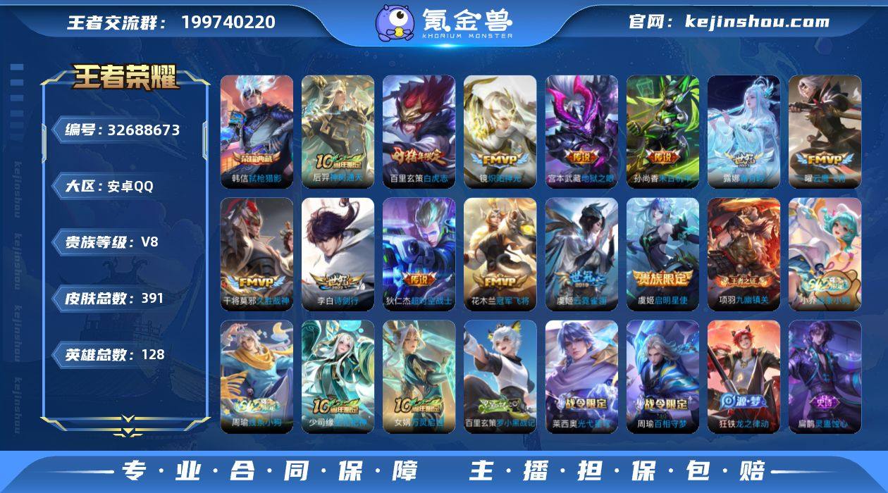 安卓Q-V8-最强王者段位-128英雄-390皮肤-1典藏皮肤-13传说-115史诗 【英雄全皮】:刘邦全皮,孙权全皮,狂铁全皮,猪八戒全皮,敖隐全皮,空空儿全皮,影全皮 【荣耀典藏】:韩信弑枪猎影 【传说皮肤】:后羿神树通天,露娜霜月吟,李白诗剑行,镜炽阳神光,虞姬启明星使,曜云鹰飞将,干将莫邪久胜战神,虞姬云霓雀翎,百里玄策白虎志,花木兰冠军飞将,孙尚香末日机甲,宫本武藏地狱之眼,狄仁杰超时空战士 【限定皮肤】:白起狰,姜子牙天穹之誓,杨戬破阵退雄兵,狄仁杰阴阳师,赵云皇家上将,墨子神迹守卫,嬴政优雅恋人,孙尚香蔷薇恋人,鲁班七号狮舞东方,庄周高山流水,高渐离死亡摇滚,阿轲迷踪丽影,钟无艳超时空战士,扁鹊奇幻香踪,白起夜都怪侠,芈月幻夜卜梦,吕布猎兽之王,元歌云间偶戏,元歌无心,夏侯惇朔风刀,甄姬游园惊梦,甄姬落雪兰心,曹操烛龙,典韦穷奇,马可波罗暗影游猎,马可波罗山海玄木吟,狄仁杰魔术师,狄仁杰万华元夜,达摩星际陆战队,达摩沙漠行僧,项羽海滩派对,老夫子醍醐杖,老夫子航海奇遇记,程咬金演武夺筹,刘邦夺宝奇兵,韩信逐梦之影,韩信飞衡,韩信傲雪梅枪,王昭君午后时光,兰陵王金庭之子,花木兰青春决赛季,亚瑟潮玩骑...