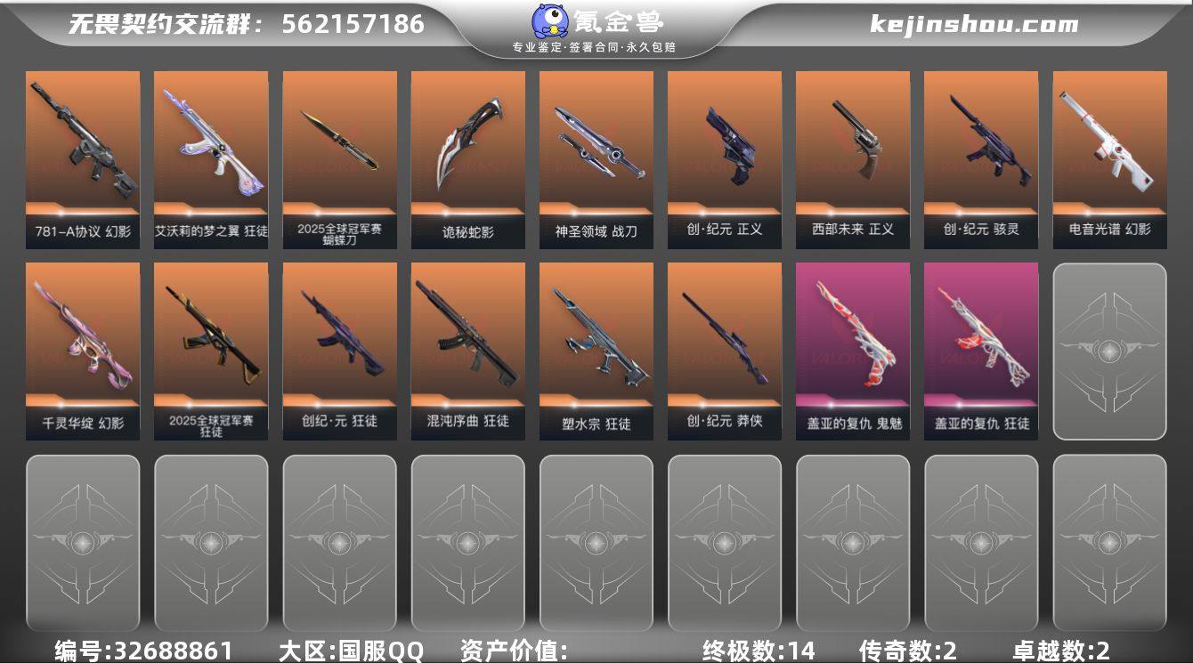 【940915】【套装】:2025全球冠军赛套装,创·纪元套装 【英雄】:幻棱,炼狱,暮蝶,钛狐,壹决,铁臂,捷风,不死鸟,贤者,猎枭,蝰蛇,芮娜,霓虹,斯凯,夜露,盖可,黑梦,钢锁 【近战武器】:近战武器-2025全球冠军赛 蝴蝶刀,近战武器-镭切,近战武器-诡秘蛇影 军刀,近战武器-神圣领域 战刀 【狂徒】:狂徒-2025全球冠军赛,狂徒-混沌序曲,狂徒-塑水宗,狂徒-创·纪元,狂徒-艾沃莉的梦之翼,狂徒-盖亚的复仇,狂徒-诡秘蛇影 【幻影】:幻影-千灵华绽,幻影-电音光谱,幻影-781-A协议,幻影-神圣领域,幻影-末日之翼,幻影-电音光谱 【戍卫】:戍卫-月球哨兵,戍卫-折光棱晶 【獠犬】:獠犬-神圣领域 【冥驹】:冥驹-星云暗涌 【飞将】:飞将-末日之翼 【莽侠】:莽侠-创·纪元,莽侠-诡秘蛇影,莽侠-月球哨兵 【战神】:战神-神圣领域 【奥丁】:奥丁-末日之翼 【判官】:判官-诡秘蛇影 【雄鹿】:雄鹿-月球哨兵 【骇灵】:骇灵-创·纪元,骇灵-星云暗涌 【蜂刺】:蜂刺-星云暗涌,蜂刺-折光棱晶 【标配】:标配-折光棱晶 【正义】:正义-创·纪元,正义-西部未来,正义-月球哨兵 【鬼魅】:鬼魅-盖亚的复仇,鬼魅-诡秘蛇影,鬼魅-星云暗涌 【狂怒】:狂怒-神圣领域 【...