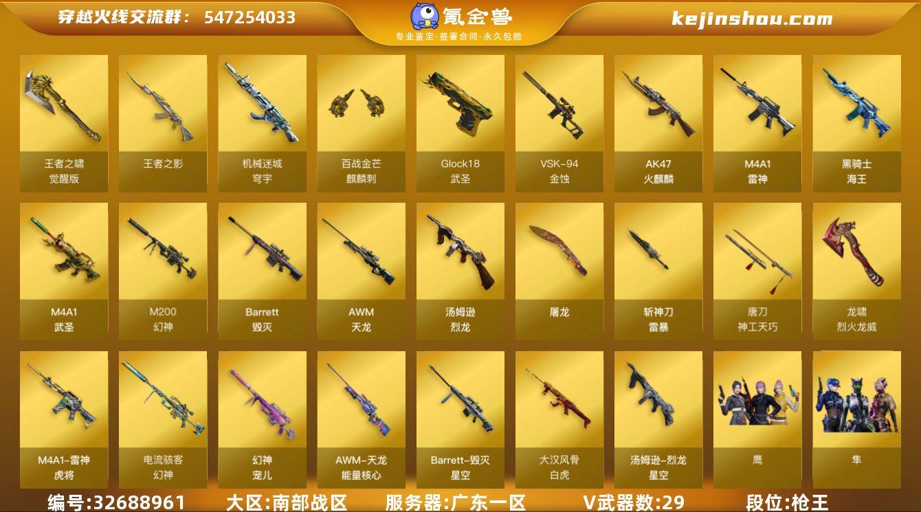 广东一区-33V-2王者武器数-0炫金武器数 【热门武器】:M200-幻神,死亡之眼,汤姆逊-烈龙*5,斯泰尔-蝴蝶 【王者炫金武器】:王者之影 【音效卡】:AK47-火麒麟音效卡 【皮肤】:幻神-宠儿-2021MVP,幻神-电流骇客 皮肤,白虎-大汉风骨,烈龙-星空,雷神-虎将,毁灭-星空,天龙-能量核心,轻型军用手斧-再燃火线 【角色】:鹰,隼,研,初恋灵狐,风暴女,嘉年华灵狐,猎狐者-追月,灵狐者-职业经理,玫瑰花神,潘多拉-X,潘多拉-甜心教官,青霞仙子,斯沃特-X,兔囡囡,樱-战斗天使,影武者-X 【人偶武器】:斯泰尔-蝴蝶,迷你生化手雷*2,灵狐娃娃手雷 【暴走生化】:死亡之眼 【挑战大师】:神圣爆裂者III,冰龙粉碎者-白马银枪 【英雄级武器】:AK47-火麒麟*2,M4A1-雷神,M4A1-武圣,黑骑士-海王,机械迷城-穹宇,AWM-天龙,Barrett-毁灭,M200-幻神,VSK-94-金蚀,汤姆逊-烈龙*5,Glock18-武圣,屠龙*2,唐刀-神工天巧,斩神刀-雷暴,麒麟刺-百战金芒,王者之啸-觉醒版,龙啸-烈火龙威,高爆手雷-雷暴*2,闪光弹-雷暴*2,烟雾弹-雷暴*2 【源级武器】:源·火麒麟*2,御·黑龙-龙太子*2,源·雷神*2,魂·雷神-新春神龙,魂-雷神-萌杀,M4A1-十二生肖·龙-雷神,御·雷神-葫芦...
