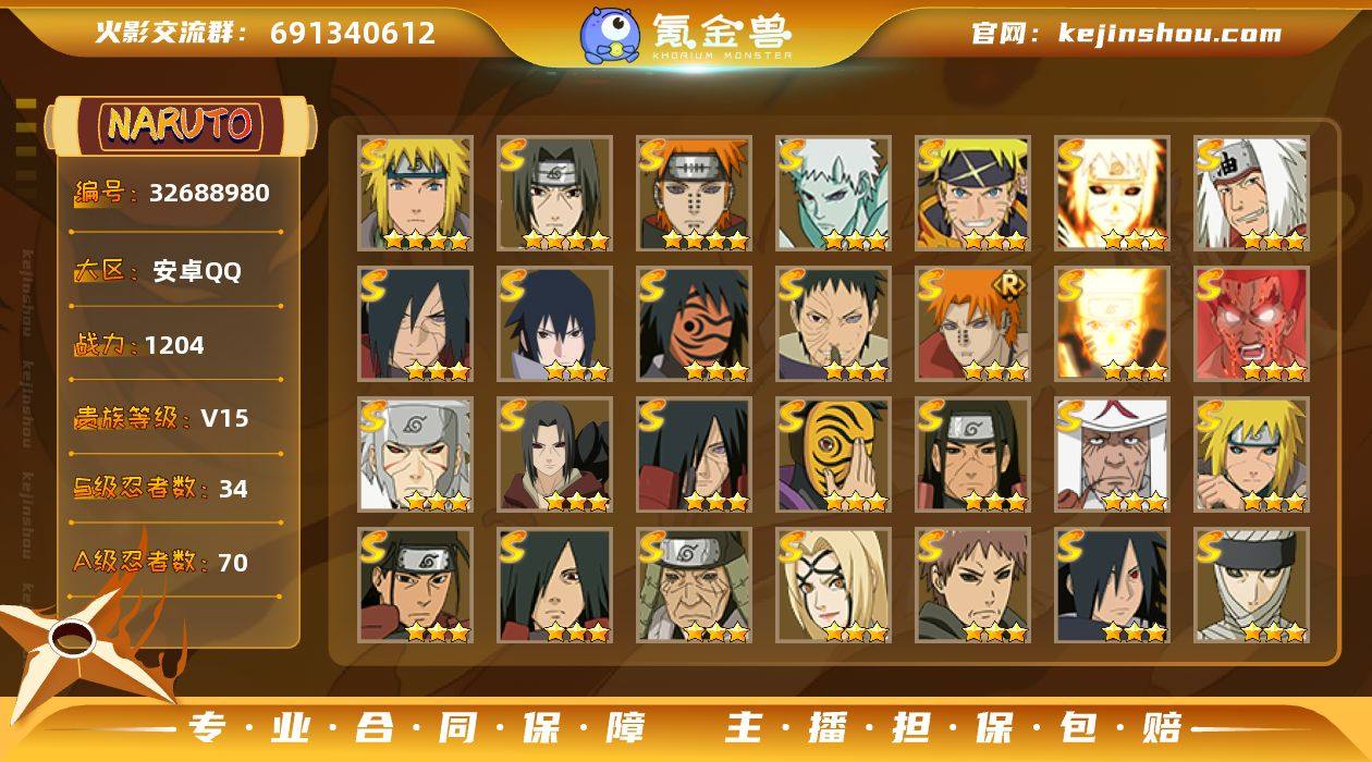 【火影忍者】战斗力:1204W+;段位:下忍3阶;本服排名:657;VIP:V15级;S忍:34个;A忍:70个;通灵兽:24个,S忍:十尾人柱力宇智波带土|秽土转生解宇智波斑|白面具宇智波斑|忍界大战宇智波带土|秽土转生千手扉间|超佩恩天道|九喇嘛连结波风水门|天道佩恩 * 4星|传说中的三忍自来也|漩涡鸣人宇智波佐助|秽土转生千手柱间|木叶创立宇智波斑|秽土转生宇智波鼬|永恒万花筒宇智波佐助|舞之豪杰自来也|大蛇丸(普通)|百豪纲手|波风水门 * 4星|秽土转生波风水门|千手柱间(普通)|秽土转生宇智波斑|宇智波斑(普通)|须佐能乎宇智波鼬 * 4星|神秘面具男(普通)|红夜之刃神秘面具男|秽土转生长门|二代目土影无|二代目水影鬼灯幻月|四代目雷影艾|四代目风影罗砂|死门迈特凯|九喇嘛连结漩涡鸣人|猿飞日斩(普通)|秽土转生猿飞日斩__A忍:青春爆炸迈特凯|仙人模式巳月|侠隐江湖纲手|幻之真容旗木卡卡西|漂泊浪客佩恩六道|忍界大战日向宁次|四代目土影黑土|木叶上忍猿飞木叶丸|火之意志继承者卑留呼|青年长门|侠隐江湖照美冥|忍者之路神秘面具男|秽土转生迪达拉|志村团藏|宇智波止水(普通) * 3星|新春限定宇智波止水|不风|忍界大战奇拉比|青年波风水门 * 3星|青年艾 * 3星|漂泊武...