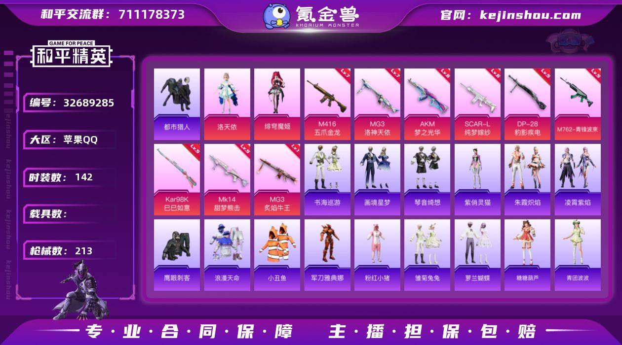 无二次-苹果手Q-2粉装-12特效枪-0载具-5粉色飞行器-66425热力值-12王牌印记-142套装-213枪皮 【热门品类】:套装-浪漫天命,套装-都市猎人,套装-小丑鱼,角色-军刀雅典娜,套装-粉红小猪 【粉色套装】:角色-洛天依,角色-绯穹魔姬 【粉色枪皮等级】:AKM-梦之光华(六级),SCAR-L-纯梦嫁纱(六级),M416-五爪金龙(七级),M762-青锋波束(五级),ACE32-萌骑漫游(三级),AKS-74U-森灵之息(五级),Kar98K-巳巳如意(五级),Mk14-甜梦熊击(五级),Mk14-福马献瑞(四级),DP-28-豹影疾电(五级),MG3-洛神天依(七级),MG3-炙焰牛王(一级) 【粉色枪皮】:AKM-梦之光华,SCAR-L-纯梦嫁纱,M416-五爪金龙,M762-青锋波束,ACE32-萌骑漫游,AKS-74U-森灵之息,Kar98K-巳巳如意,Mk14-甜梦熊击,Mk14-福马献瑞,DP-28-豹影疾电,MG3-洛神天依,MG3-炙焰牛王 【粉色飞行器】:炫彩糖果飞行器,春暖花开飞行器,齐天大圣飞行器,拂晓神骑飞行器,BEARBRICK飞行器 【粉色降落伞】:春暖花开降落伞,神秘黑猫降落伞,暗夜玫瑰降落伞,洛神天依降落伞,碧影闪光降落伞,环太平洋降落伞,第五大道降落伞,仲夏莫吉托降落伞,临安公主降落伞,异瞳寒姬降落伞,炫彩糖果降落伞 【稀有套装】:套装-雪...