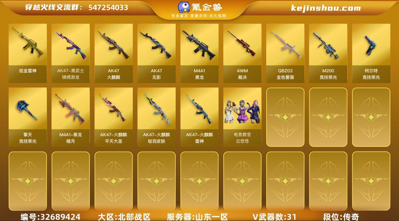 【编号69556,可秒换绑】【爆破号足够用!竞技荣光套(5把刀/5套雷)/AWM-裁决/QBZ03-金色蔷薇/USP-雷暴/M4A1-黑龙(音效卡+暗月皮)/三防云悠悠!】,山东一区-33V-0王者-1炫金 【热门武器】:QBZ03-金色蔷薇,M200-竞技荣光,USP-雷暴 【王者炫金武器】:炫金雷神 【音效卡】:M4A1-黑龙音效卡 【皮肤】:火麒麟-雷神,火麒麟-轻羽皮肤,火麒麟-平天大圣,黑龙-暗月 【角色】:电竞教官-云悠悠,初恋灵狐,芳心审判者,飞虎队-X,娟娟,龙儿,潘多拉-X,潘多拉-甜心教官,潜龙队-X,樱-战斗天使,影武者-X 【人偶武器】:迷你深渊冰龙,迷你裂空之翼*2 【挑战大师】:神圣爆裂者III,冰龙粉碎者-白马银枪,机甲撕裂者III,VEPR-12-紫魔 【英雄级武器】:AK47-火麒麟,M4A1-黑龙,AK47-无影,黑武士-锦绣游龙,QBZ03-金色蔷薇,AWM-裁决,M200-竞技荣光,USP-雷暴,柯尔特-竞技荣光,擎天-竞技荣光*5,高爆手雷-竞技荣光*5,闪光弹-竞技荣光*5,烟雾弹-竞技荣光*5 【道具】:战舰背包,绿色巨人,灵魂忍者,夺命之镰,防化服,EP战队名片,防弹头盔*4,防弹衣*4,C4工具钳*4,手雷包*4 【特殊枪械】: 【稀有套装】:竞技荣光套