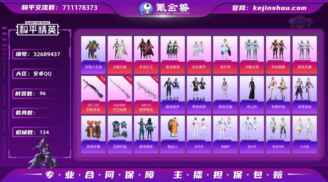 【kyhp212】安卓 手Q-8粉装-3特效枪-0载具-2粉色飞行器-42504热力值-4王牌印记-96套装-134枪皮 【热门品类】:套装-深海小丑鱼,套装-龟仙人 【粉色套装】:粉装-冰霜白皇,粉装-炙焰红王,粉装-银龙傲海,粉装-彩虹鹿灵,角色-洛天依,粉装-冷魅冰骑,粉装-赤焰黑爵,粉装-紫电风暴 【粉色枪皮等级】:Kar98K-巳巳如意(五级),Mk14-甜梦熊击(五级),DP-28-豹影疾电(五级) 【粉色枪皮】:Kar98K-巳巳如意,Mk14-甜梦熊击,DP-28-豹影疾电 【粉色飞行器】:梦幻舞会飞行器 【粉色降落伞】:梦幻火箭降落伞,星之彼岸降落伞,烈焰拳霸降落伞,暗夜玫瑰降落伞,林间仙鹿降落伞,碧影闪光降落伞,冷魅冰骑降落伞,第五大道降落伞,梦幻舞会降落伞,冷漠罗丽降落伞,异瞳寒姬降落伞,炫彩糖果降落伞 【稀有套装】:套装-龟仙人,套装-粉恋花,套装-紫幽梦,套装-蓝冰羽,套装-极速光影,套装-云朵鹅,套装-雪绒豹,角色-乐音,套装-朱霞炽焰,套装-凌霄紫焰,角色-申公豹,角色-紫俏灵猫,套装-画境星梦,套装-琴音绮想 【稀有枪皮】:AKM-灼热熔岩,AKM-破晓战魂,AKM-虎虎生威,M16A4-夜灯,M16A4-幻世战舞者,M16A4-红色方程式,SCAR-L-炫彩节奏,SCAR-L-红色方程式,SCAR-L-冷...