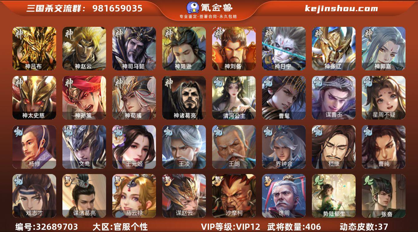 【1466】官阶:大将军;VIP等级:VIP12;史诗武将数量:50;动态皮肤数量:37;武将总数:406;史诗宝珠数量:1;将魂数量:5613;神将:15;魏国史诗武将:18;蜀国史诗武将:5;吴国史诗武将:7;群史诗武将:17 神吕布,神赵云,神司马懿,神陆逊,神刘备,神甘宁,神张辽,神郭嘉,神太史慈,神孙策,神荀彧,神关羽,神吕蒙,神周瑜,神诸葛亮,曹髦,星周不疑,杨修,文鸯,王元姬,王凌,王朗,界钟会,嵇康,曹纯,戏志才,谋曹丕,清河公主,谋诸葛亮,马云騄,谋赵云,沙摩柯,谯周,张奋,周处,骆统,留赞,界徐盛,贺齐,势陆郁生,谋郭嘉,左慈,郑玄,星黄忠,麹义,祢衡,沮授,界李儒,卑弥呼,鲍信,谋张角,张绣,阎象,许攸,谋吕布,友徐庶,笮融,神郭嘉-倚星折月(动态),神太史慈-勇撼日月(动态),神孙策-霸王再世(动态),神荀彧-匡汉延祚(动态),神吕蒙-心生万象,神甘宁-万人辟易(动态),神关羽-血海罗刹(动态),神曹操-四方归心(动态),神司马懿-鉴往知来(动态),郭嘉-以身证道(动态),星周不疑-才广志宏(动态),曹植-龙年中秋(动态),钟会-潜蛟觊天(动态),甄姬-明珠耀躯(动态),曹丕-龙年中秋(动态),戏志才-举棋若定(动态),曹纯-长坂败备(动态),清河公主-魅影萦心(动态),孟获-祸崇南疆(动态),诸葛亮-龙年限定(动态),鲍三娘-嫣然一...