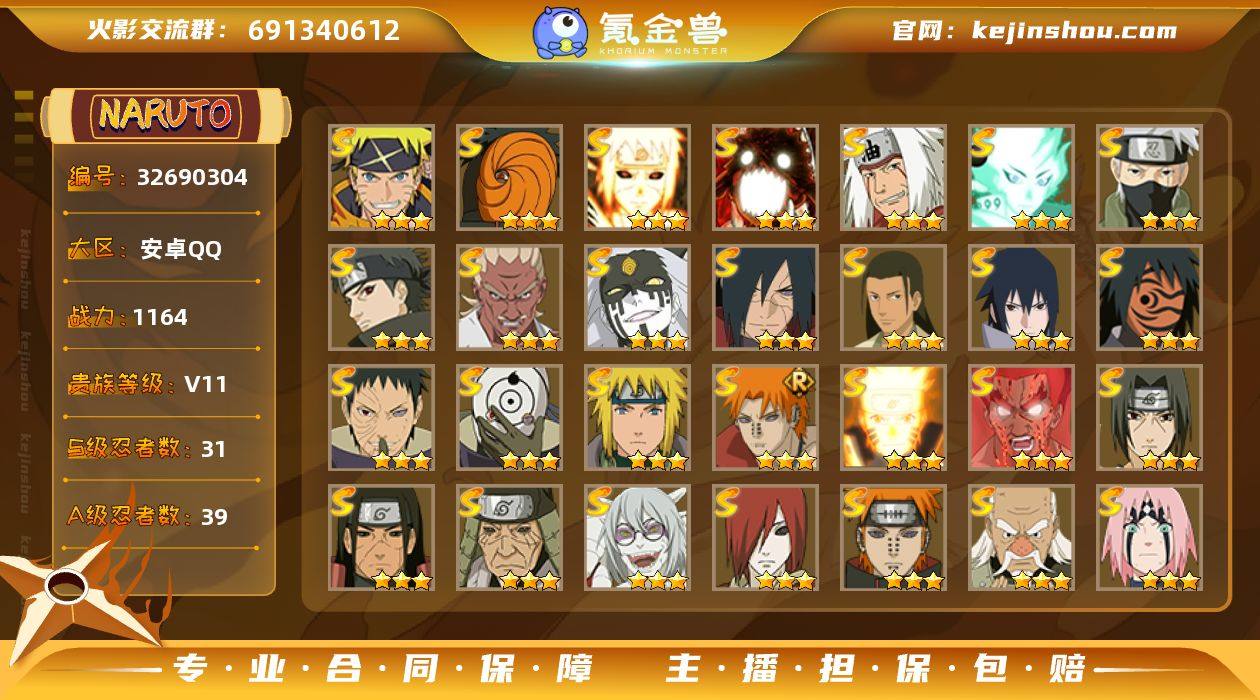 0BAQOA 号 VIP11,1164W战力,S忍32个,A忍45个,本服前500,战区未上榜,通灵兽23个,8时装,点券400,金币13420,高招券0,暗部2阶,忍者星数538