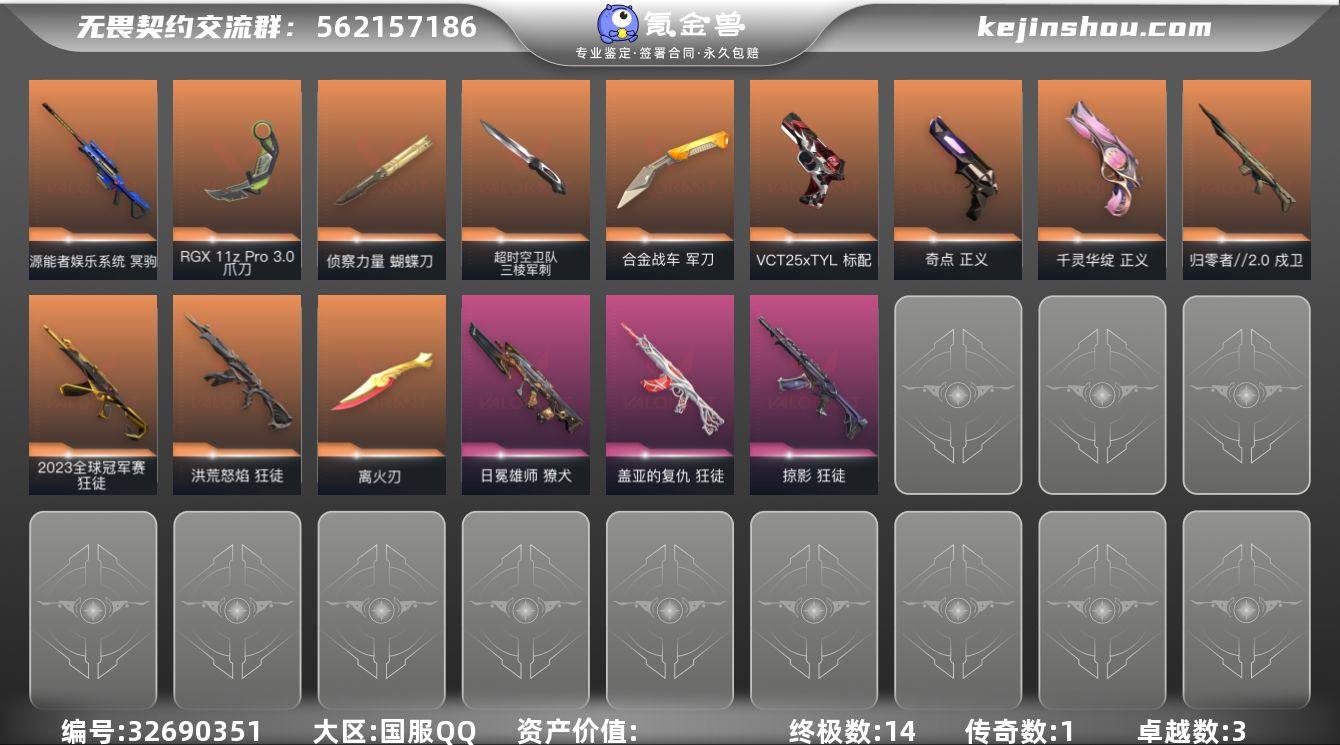 w4748 【极品号】超时空三棱军刺 天御刀 奇点正义 未来开拓者 流脓狂徒 日冕獠犬 天玄刀 vct25tyl标配 归零戍卫 显卡爪刀 掠夺狂徒 侦查蝴蝶刀 莲花正义 电玩大狙 盖亚狂徒 23狂徒 离火刃库存: 37460剩余VP:45剩余R点:415 段位:未定级(铂金)