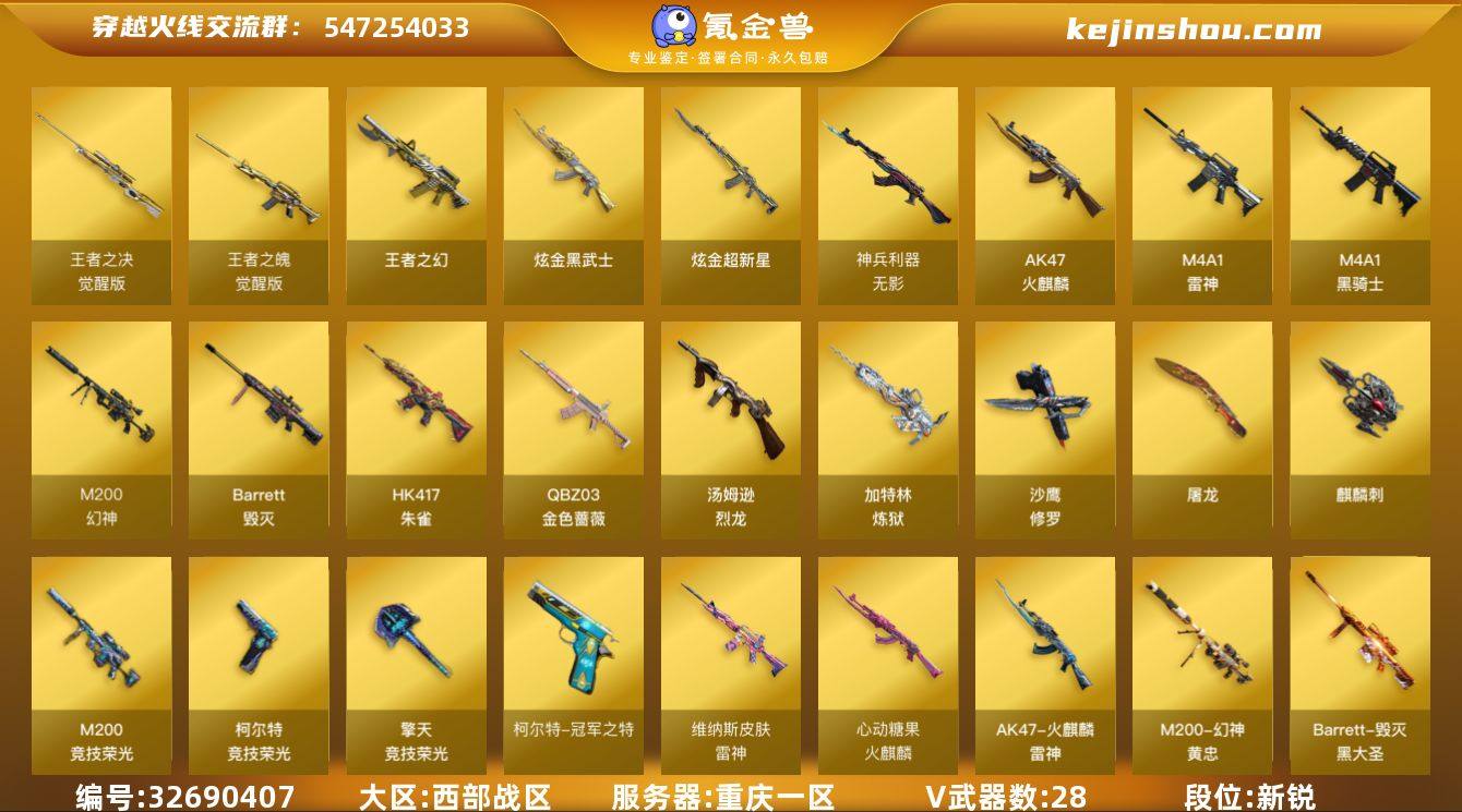 【ylw-cf1727】重庆一区-31V-3王者-2炫金 【传说角色】:传说星骇 【热门武器】:QBZ03-金色蔷薇,HK417-朱雀,M200-幻神,M200-竞技荣光,死亡之眼,柯尔特-冠军之特,M4A1-黑骑士,汤姆逊-烈龙,加特林-炼狱,裁决-雪莉杨,USP-雷暴,沙鹰-修罗*3,金刚伞 【王者炫金武器】:王者之幻,炫金武士,炫金超新星 【音效卡】:白鲨语音包 【皮肤】:M200-幻神-黄忠皮肤,QBZ03-冠军之薇,雷神-维纳斯皮肤,火麒麟-雷神,火麒麟-心动糖果,毁灭-冠军之怒,毁灭-黑大圣皮肤 【角色】:樱,瞳,电竞教官-云悠悠,空,嘉年华灵狐,潘多拉-X,赛斯-X,斯沃特-X,影武者-X,职业选手 【人偶武器】:裁决-雪莉杨,AWM-灵狐-15周年嘉年华,迷你生化手雷 【暴走生化】:死亡之眼,超级对讲机 【挑战大师】:激光毁灭者III-白马银枪 【英雄级武器】:AK47-火麒麟,M4A1-雷神*2,M4A1-黑骑士,HK417-朱雀,无影-神兵利器,QBZ03-金色蔷薇,王者之魄-觉醒版,Barrett-毁灭,M200-幻神,M200-竞技荣光,Barrett-金色蔷薇,王者之决-觉醒版,加特林-炼狱,汤姆逊-烈龙,沙鹰-修罗*3,USP-雷暴,柯尔特-冠军之特,柯尔特-竞技荣光,屠龙*3,麒麟刺,擎天-竞技荣光,高爆手雷-竞技荣光,闪光弹-竞...