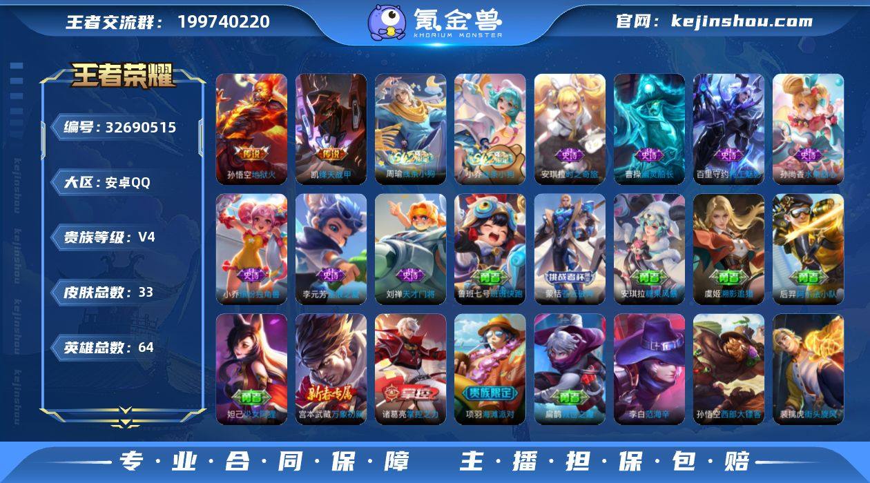 实名: 可修改 贵族等级: V4 英雄数: 64 皮肤数: 33 传说皮: 绛天战甲,地狱火 亮点: 贵族4/皮肤33/传说3/史诗11/英雄64/貂蝉神骥聚万邦/绛天战甲/地狱火/海滩派对/线条小狗-周瑜/线条小狗-小乔/上官婉儿春霖将至/明世隐百晓客/罗小黑战记/时之奇旅-安琪拉/逐浪之夏/天才门将/特工魅影/缤纷独角兽/幽灵船长/水果甜心/影百相守梦/班班快跑/苍云破阵/糖果风暴/溯影追猎/掌控之力/阿尔法小队/万象初新/少女阿狸/救世之瞳/修竹墨客/街头旋风/范海辛/隐刃/英喵野望/西部大镖客-孙悟空/异域舞娘