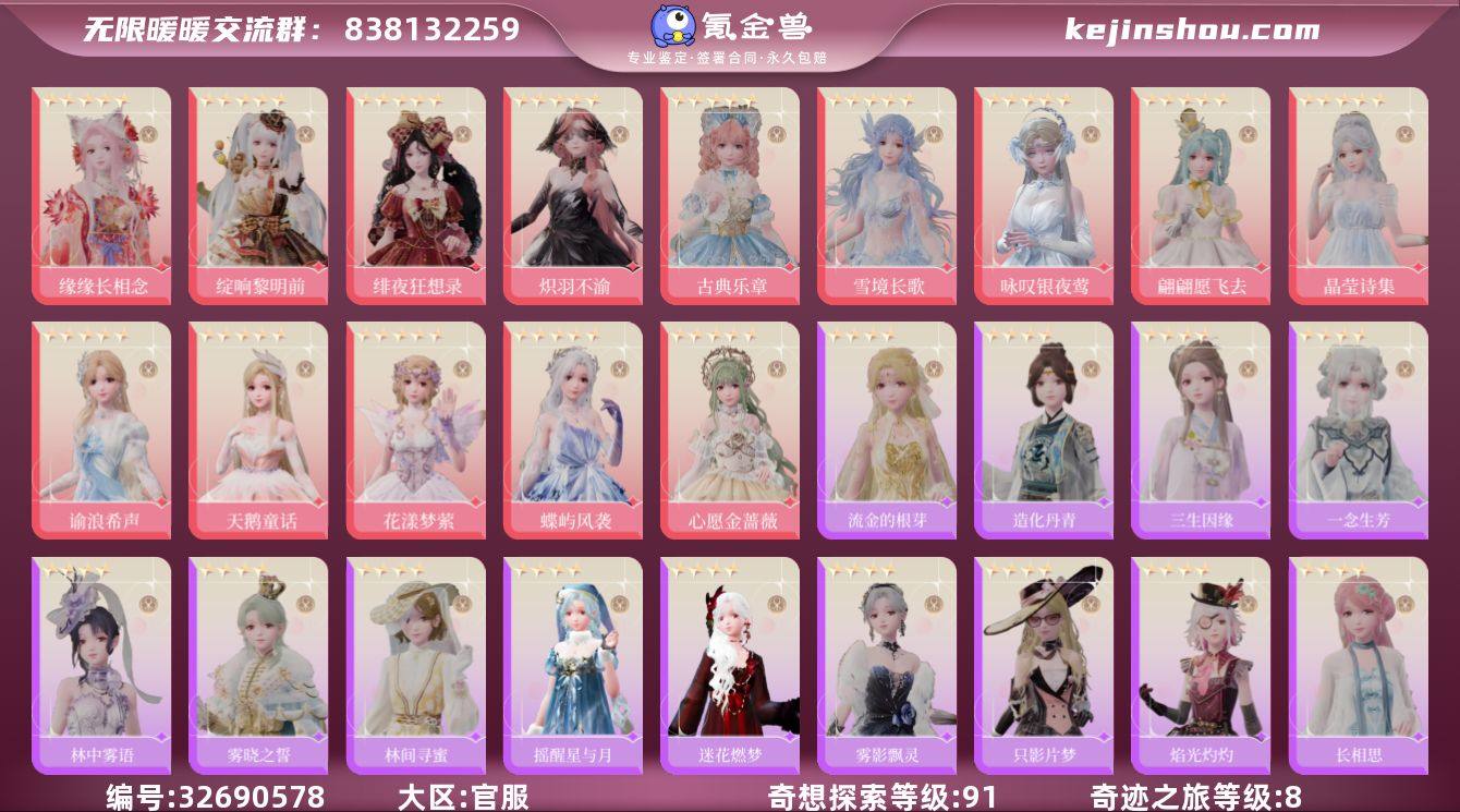 限定五星:绯闻狂想2 古典乐章2 绽响黎明前 3 雪境长歌2炽羽不渝2源源长相思2(2一进3二进) 限定4星: 裁剪艺术2雾隐飘灵2摇醒星与月2一念生芳2 限定五星:3套 有大裙子 限定四星:1套青蛙有裙子