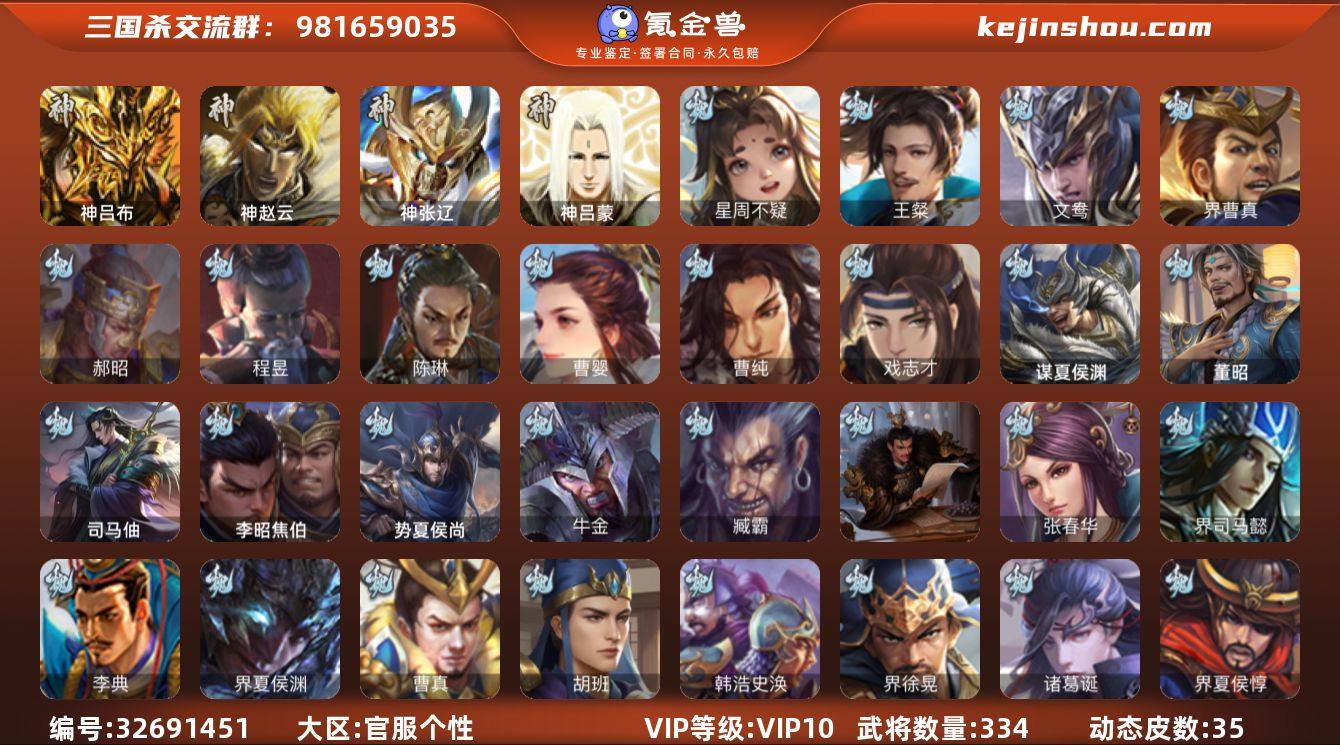 【4224】官阶:大将军;VIP等级:VIP10;史诗武将数量:33;动态皮肤数量:35;武将总数:334;史诗宝珠数量:0;将魂数量:4836;神将:3;魏国史诗武将:12;蜀国史诗武将:7;吴国史诗武将:6;群史诗武将:10