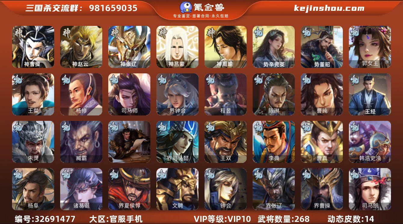 VIP等级: VIP10 官阶: 骠骑将军 武将数量: 268 动态皮肤数量: 14 神将: 神曹操,神张辽,神赵云,神吕蒙,神周瑜 魏国武将: 曹纯,陈琳,程昱,界钟会,司马师,杨修,王粲,张辽,SP关羽,SP贾诩,SP姜维,卞夫人,蔡贞姬,曹昂,曹操,曹冲,曹洪,曹丕,曹仁,曹叡,贾逵,王异,鲁芝,满宠,荀攸,钟繇,郭嘉,荀彧,界郭嘉,崔琰,界荀彧,朱灵,界王异,界许褚,界郭淮,华歆,陈群,界邓艾,乐进,辛宪英,郭淮,郭皇后,夏侯惇,曹植,司马朗,界曹操,许褚,界张辽,钟会,文聘,郭女王,曹彰,界夏侯惇,诸葛诞,司马懿,甄姬,杨阜,徐晃,韩浩史涣,曹真,典韦,夏侯渊,李典,于禁,王双,邓艾,界司马懿,孟达-魏,臧霸,朱灵(国战),势董昭,王经,势辛宪英 蜀国武将: 马云騄,徐庶,界关羽,邓芝,胡金定,界张嶷,赵云,张松,李丰,界刘备,刘封,糜竺,谋庞统,黄月英,刘巴,关羽,吴懿,吴班,张飞,魏延,谋祝融,界法正,糜夫人,刘禅,界赵云,界姜维,关银屏,SP孙尚香,SP徐庶,卧龙诸葛,周仓,简雍,谋孟获,界关兴张苞,诸葛亮,界张飞,法正,界简雍,陈到,界马岱,关平,马岱,界庞统,庞统,诸葛果,谋张飞,马谡,马超,廖化,关兴张苞,孟获,姜维,黄忠,刘备,界马超,马良,傅肜,刘谌,甘夫人,SP甘夫人,势魏延,势陈到,势陈祗 吴国武将: 界徐盛,界朱然,留赞,骆统,陆绩,周泰,吕蒙,...