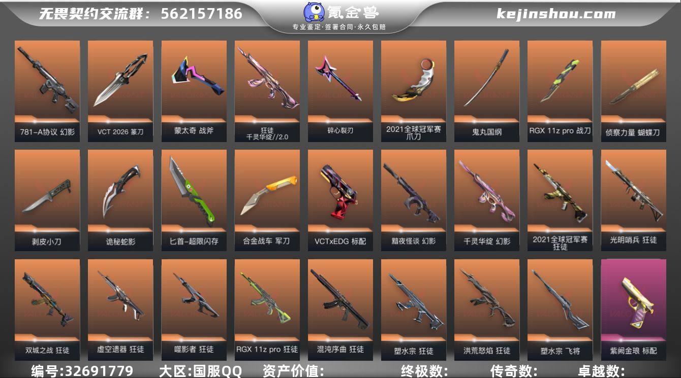 S194199【21冠军套】无畏契约/280等级/未定级段位/28英雄/105皮肤/资产63580/已使用R点1595/剩余R点5/ 2021全球冠军赛-狂徒,2021全球冠军赛-爪刀,RGX-11z-Pro-狂徒,千灵华绽//2.0-狂徒,虚空遗器-狂徒,噬影者-狂徒,光明哨兵-狂徒,混沌序曲-狂徒,双城之战-狂徒,千灵华绽-幻影,黯夜怪谈-幻影,洪荒怒焰-狂徒,塑水宗-狂徒,781-A协议-幻影,神中神罚-幻影,堕天遗武-狂徒,紫阙金琅-狂徒,盖亚的复仇-狂徒,侦察力量-幻影,耀鳞威龙-狂徒-,般若假面-幻影,掠影-狂徒,VCT-2026-篆刀,蒙太奇-战斧,碎心裂刃,诡秘蛇影-军刀,超限闪存-匕首,合金战车-军刀,RGX-11z-Pro-战刀,鬼丸国纲,剥皮小刀,侦察力量-蝴蝶刀,塑水宗-飞将,堕天遗武-冥驹,离子武器-冥驹,紫阙金琅-骇灵,起源-雄鹿,VCT-x-EDG-标配,天界神兵-鬼魅,紫阙金琅-标配,离子武器-正义