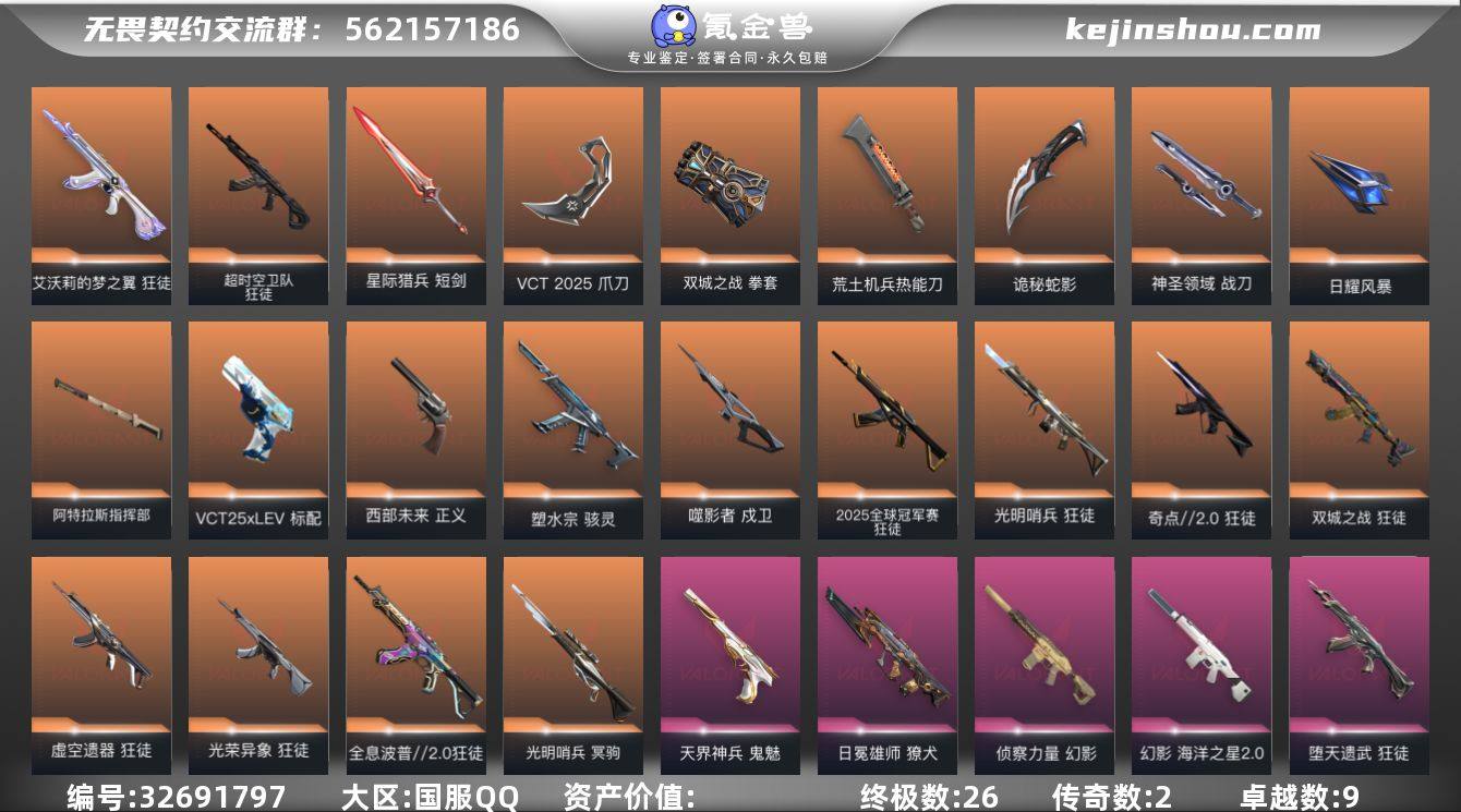 【QWW12240】【套装】:VCT 2025 赛季套装,《双城之战》收藏套装 【英雄】:幻棱,炼狱,维斯,暮蝶,钛狐,壹决,铁臂,捷风,雷兹,幽影,不死鸟,贤者,猎枭,蝰蛇,零,芮娜,奇乐,尚勃勒,霓虹,斯凯,夜露,星礈,K/O,海神,盖可,黑梦,钢锁 【近战武器】:近战武器-穿花蝴蝶,近战武器-VCT 2025 爪刀,近战武器-紫金爪刀,近战武器-双城之战 拳套,近战武器-荒土机兵 热能刀,近战武器-破败王者之残刃,近战武器-魄月玄刃,近战武器-圣石匕首,近战武器-天玄刀,近战武器-诡秘蛇影 军刀,近战武器-神圣领域 战刀,近战武器-日耀风暴 遗器,近战武器-阿特拉斯指挥部 甩棍,近战武器-星际猎兵 短剑 【狂徒】:狂徒-艾沃莉的梦之翼,狂徒-超时空卫队,狂徒-2025全球冠军赛,狂徒-光明哨兵,狂徒-奇点//2.0,狂徒-全息波普//2.0,狂徒-双城之战,狂徒-虚空遗器,狂徒-光荣异象,狂徒-堕天遗武,狂徒-日冕雄师,狂徒-紫阙金琅,狂徒-离子武器//2.0,狂徒-荒土机兵,狂徒-诡秘蛇影 【幻影】:幻影-侦察力量,幻影-海洋之星//2.0,幻影-手工达人,幻影-神圣领域,幻影-纳米打击,幻影-神罚,幻影-末日之翼 【戍卫】:戍卫-噬影者,戍卫-逆冲蛮牛,戍卫-月球哨兵,戍卫-折...