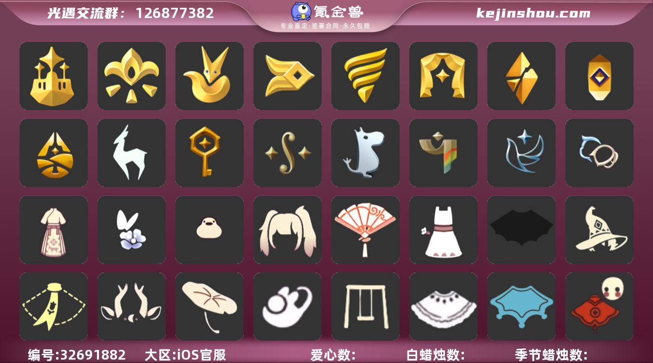 账号类型: 手机账号 季节已毕业: 梦想季,小王子季,风行季,潜海季,表演季,破晓季,集结季,追忆季,归巢季,九色鹿季,筑巢季,二重奏季,姆明季,彩染季,青鸟季,双星季 完成地图: 晨岛,云野,雨林,霞谷,暮土,禁阁,全图毕业 珍稀物品: 白枭,玫瑰花 礼包: 蝙蝠套,巫师,围巾,九色鹿角,荷叶伞,兔子鞋,秋千,白绒金,瑞雪,福娃,橘子,贝壳,红伞,兔子,南瓜,雪花,水母,星月头饰,彩虹耳钉,彩虹耳机,新年裤,四叶草,向日葵套,新年耳钉,创始人,海蓝波浪发型,满月耳坠,向日葵连衣裙,献瑞折扇礼包,渐变双马尾发型礼包,小黄鸭发饰礼包,蝴蝶与花发饰礼包,琅骏启岁长裙礼包 裤子: 武士裤,背带裤,白棉裤,搓澡巾 面具: 黄鼠狼,红狐狸 面饰: 红耳机,黑框眼镜 项链: 围巾 发型: 蝴蝶结,正太,樱花,公主头,虚荣,猫耳,白枭 头饰: 花环 斗篷: 白金,红金,白鸟斗,花瓣斗篷,荧蓝斗篷 配饰: 雨伞,高音钢琴,吉他,笛子,大铃铛乐器,乐器 亮点: 重塑药水129