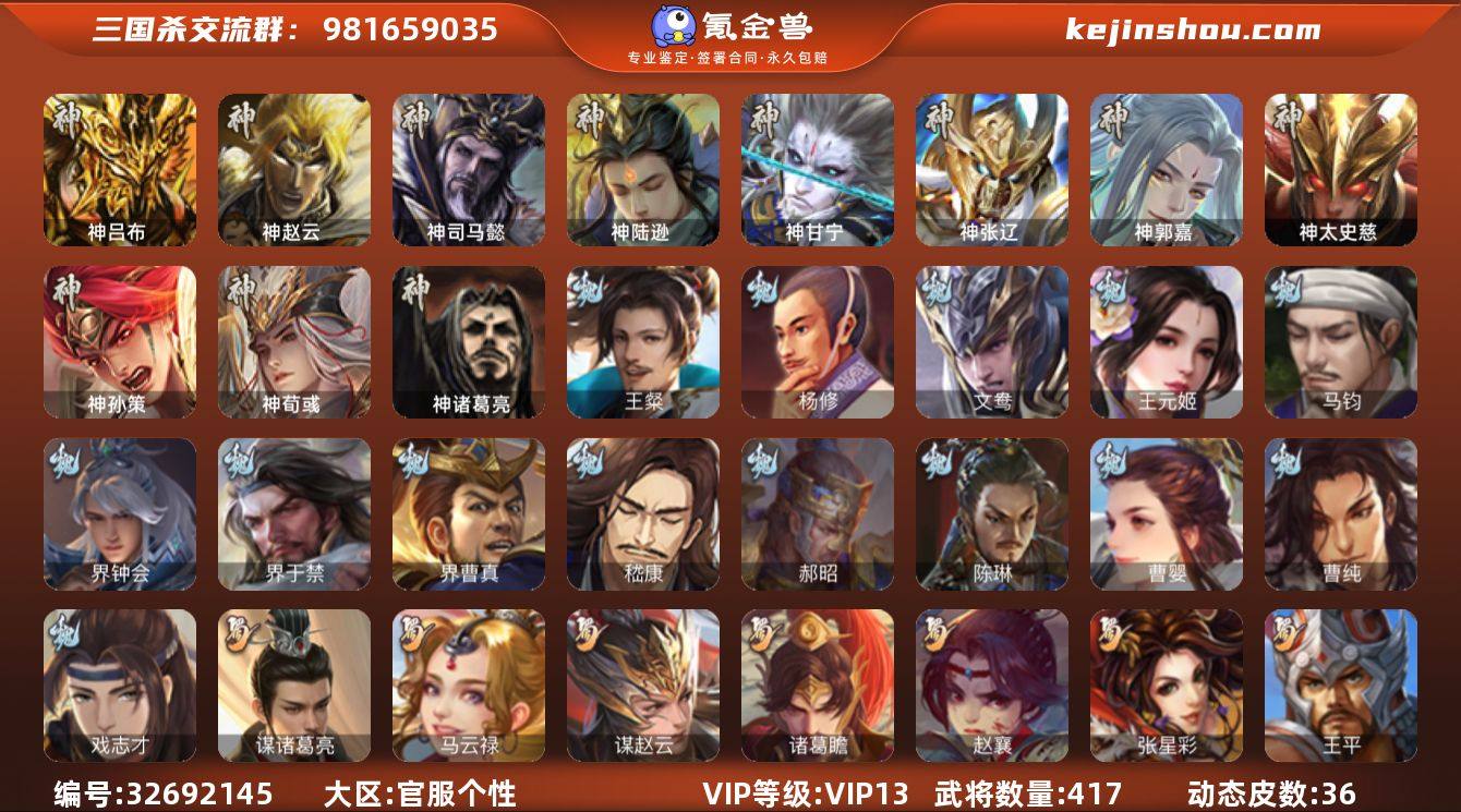 【1522】官阶:大将军;VIP等级:VIP13;史诗武将数量:62;动态皮肤数量:36;武将总数:417;史诗宝珠数量:0;将魂数量:0;神将:13;魏国史诗武将:31;蜀国史诗武将:12;吴国史诗武将:6;群史诗武将:19 神吕布,神赵云,神司马懿,神陆逊,神甘宁,神张辽,神郭嘉,神太史慈,神孙策,神荀彧,神吕蒙,神周瑜,神诸葛亮,王粲,杨修,文鸯,王元姬,马钧,界钟会,界于禁,界曹真,嵇康,郝昭,陈琳,曹婴,曹纯,戏志才,关索,谋诸葛亮,马云騄,谋赵云,诸葛瞻,赵襄,张星彩,王平,沙摩柯,界黄忠,花鬘,董允,吴景,孙寒华,骆统,留赞,界朱然,界徐盛,左慈,张琪瑛,徐荣,王允,苏飞,司马徽,麹义,南华老仙,祢衡,刘焉,沮授,界左慈,界李儒,公孙康,杜预,卑弥呼,张绣,李傕,许攸,神张辽-威震江东,神郭嘉-虎年清明(动态),神郭嘉-倚星折月(动态),神孙策-霸王再世(动态),神荀彧-虎年清明(动态),神荀彧-匡汉延祚(动态),神甘宁-万人辟易(动态),神曹操-天下归心,SP司马昭-鼠年冬至(动态),星周不疑-才广志宏(动态),郭嘉-十胜十败(动态),曹丕-牛年清明(动态),王粲-笔翰如流(动态),界郭嘉-十胜十败(动态),界曹丕-牛年清明(动态),张春华-宣穆夜袭(动态),王异-轻燕掠影(动态),钟会-谋谟之勋(动态),界王异-轻燕掠影(动态),界钟会-谋谟之...