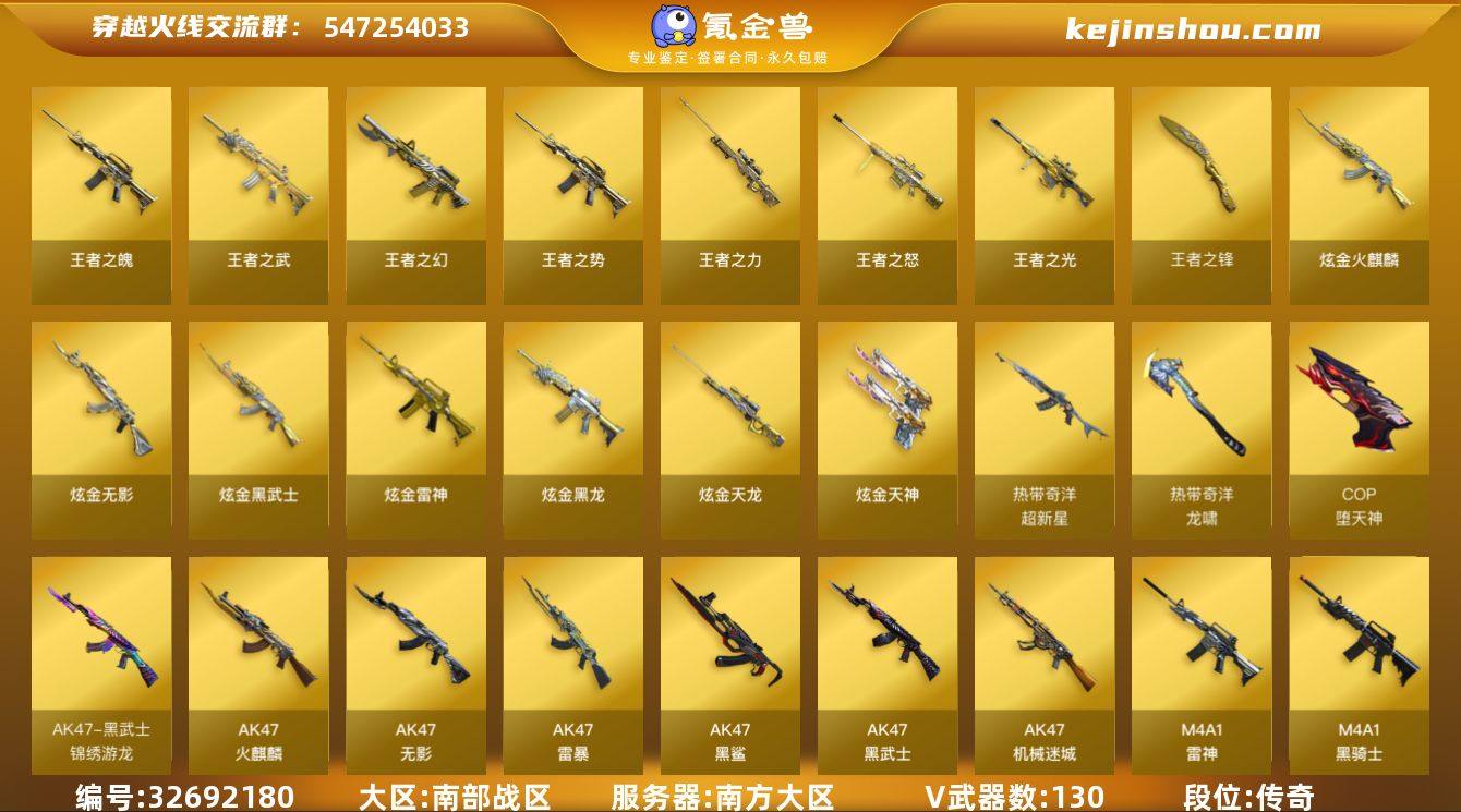 【穿越火线CF-2522】南方大区-135V-19王者-7炫金 【热门武器】:QBZ03-金色蔷薇,HK417-朱雀,M200-幻神,M4A1-黑骑士,汤姆逊-烈龙*4,RPK-盘龙,加特林-炼狱*4,火麒麟-绝迹,USP-雷暴,COP-堕天神,沙鹰-修罗*5 【王者炫金武器】:炫金火麒麟,炫金无影,炫金天龙,炫金天神,炫金黑龙,炫金雷神,炫金武士,王者之幻,王者之势,王者之武,王者之光,王者之怒,王者之力,王者之魄,王者之锋 【音效卡】:Scar Light-白虎-热带奇洋音效卡,AK47-火麒麟音效卡,M4A1-雷神音效卡,Barrett-毁灭音效卡 【稀有皮肤】:雷神-能量核心,雷神-荣耀之魄,火麒麟-冠军之心,黑骑士-暗月*3,毁灭-暗月,毁灭-荣耀之怒,毁灭耀金皮肤,毁灭-冠军之怒,天龙-秘银,天龙-能量核心,无影耀金皮肤,天神-暗月*2 【角色】:王者-瞳-闭月羞花,王者-葵-貂蝉,王者-零,雅典娜,零-水下丽影,零,葵,炫,春,战地猎狐,蜀雪,铁骑荣耀,青霞仙子 【人偶武器】:火麒麟-绝迹,COP-旗袍,夺魂,迷你牛牛,生化手雷-机甲核心,闪光弹-貂蝉,高爆手雷-大乔 【挑战大师】:神圣爆裂者III,神圣爆裂者-末日III,阐释者III,冰龙粉碎者-白马银枪 【英雄级武器】:马来剑-夜魔,COP-堕天神,AK47-雷...