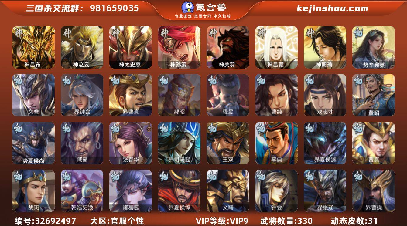 官阶:大将军;VIP等级:VIP9;史诗武将数量:33;动态皮肤数量:31;武将总数:330;史诗宝珠数量:0;将魂数量:4054;神将:4;魏国史诗武将:8;蜀国史诗武将:5;吴国史诗武将:4;群史诗武将:13
