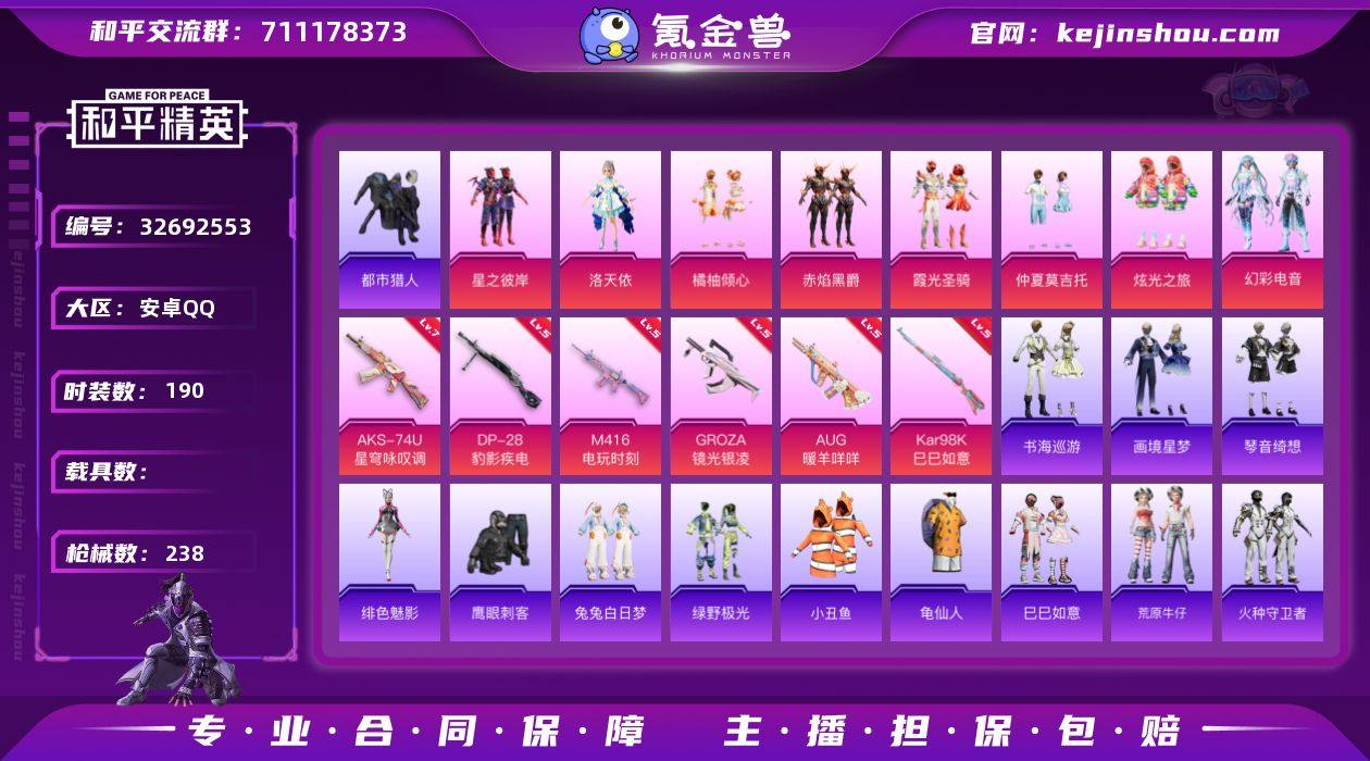 【kyhp420】安卓 手Q-8粉装-6特效枪-0载具-2粉色飞行器-68658热力值-4王牌印记-190套装-238枪皮 【热门品类】:套装-都市猎人,套装-小丑鱼,套装-龟仙人 【粉色套装】:粉装-星之彼岸,角色-洛天依,粉装-橘柚倾心,粉装-赤焰黑爵,粉装-霞光圣骑,粉装-仲夏莫吉托,粉装-炫光之旅,粉装-幻彩电音 【粉色枪皮等级】:M416-电玩时刻(五级),GROZA-镜光银凌(五级),AUG-暖羊咩咩(五级),AKS-74U-星穹咏叹调(七级),Kar98K-巳巳如意(五级),DP-28-豹影疾电(五级) 【粉色枪皮】:M416-电玩时刻,GROZA-镜光银凌,AUG-暖羊咩咩,AKS-74U-星穹咏叹调,Kar98K-巳巳如意,DP-28-豹影疾电 【粉色飞行器】:星夜魔法师飞行翼 【粉色降落伞】:幻影战神降落伞,洛神天依降落伞,天之羽翼降落伞,环太平洋降落伞,垂柳戏鸭降落伞,音爆索尼克降落伞,圣堂之誓降落伞,冠军兔兔降落伞,忍者神龟降落伞,动力核心降落伞,鬼刀降落伞,幻星舰长降落伞,异瞳寒姬降落伞,极意拳锋降落伞,炫彩糖果降落伞 【稀有套装】:套装-龟仙人,套装-巳巳如意,套装-荒原牛仔,套装-雪国风尚,套装-火种守卫者,套装-糖糖葫芦,套装-青团波波,套装-燕燕于飞,套装-鱼渊荷华,套装-迷雾之月,角色-海琴烟...