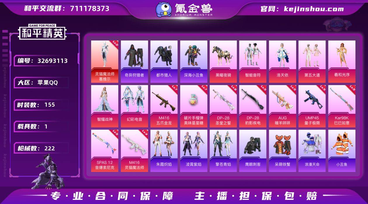 【941028】苹果 手Q-1神装-6粉装-10特效枪-1载具-6粉色飞行器-72530热力值-17王牌印记-155套装-222枪皮 【红色神装等级】:灵猫魔法师-塞维尔(二级) 【红色角色神装】:灵猫魔法师-塞维尔 【热门品类】:套装-浪漫天命,套装-都市猎人,套装-深海小丑鱼,套装-小丑鱼,套装-奇异狩猎者,套装-龟仙人,套装-暗影哥特,套装-粉红小猪,角色-Mark.06,熔岩游骑兵连帽夹克 【粉色套装】:粉装-智能音符,角色-洛天依,粉装-第五大道,角色-羲和光序,角色-智耀战神,粉装-幻彩电音 【粉色枪皮等级】:M416-五爪金龙(七级),M416-灵猫魔法师(三级),AUG-暖羊咩咩(五级),UMP45-量子极限(五级),Kar98K-巳巳如意(五级),SPAS-12-音爆索尼克(五级),DP-28-圣堂之誓(六级),DP-28-豹影疾电(五级),PKM-萌骑夺宝(三级),破片手榴弹-美味星星糖(七级) 【粉色载具】:黑曜夜骑 【粉色枪皮】:M416-五爪金龙,M416-灵猫魔法师,AUG-暖羊咩咩,UMP45-量子极限,Kar98K-巳巳如意,SPAS-12-音爆索尼克,DP-28-圣堂之誓,DP-28-豹影疾电,PKM-萌骑夺宝,破片手榴弹-美味星星糖 【粉色飞行器】:祥瑞起舞飞行器,神秘黑猫飞行器,镜域双华-灵镜之阶,龙翔九天飞行器,曦光华影飞行器,灵猫魔法...