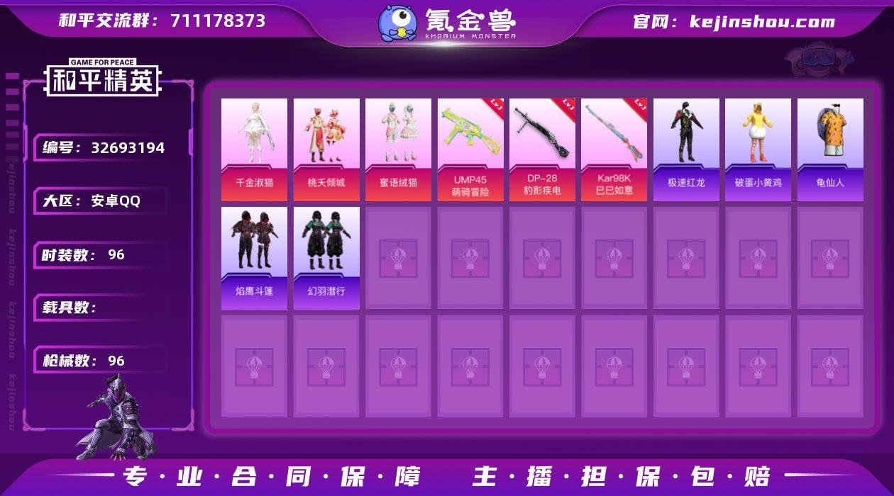 DYH18015【公主号可二次实名 桃夭倾城,角色-千金淑猫,蜜语绒猫 都市丽猫 3粉装-5特效枪】安卓手Q-3粉装-5特效枪-96套装-96枪皮-9王牌印记-传奇王牌7星-30633热力值【3粉装】桃夭倾城,角色-千金淑猫,蜜语绒猫【5特效枪】UMP45-萌骑冒险[2级],Kar98K-巳巳如意[4级],Mk14-福马献瑞[5级],DP-28-豹影疾电[3级],信号枪-金乌曜日[4级]【6飞行器】荒原烈焰飞行器,光之冒险尾迹,炫彩糖果飞行器,登顶巅峰飞行器,云朵驼驼飞行器,马上有福飞行器【184其它衣服和枪皮】角色-都市丽猫,白色伏地魔,SS31特训,丛林猎人,龙的传人,玉兔迎春,和煦暖阳,春光漫游,大橘大利,SS37特训,幻影武者,空岛之星,角色-糖霜甜心,蓝彩潮人,炫彩糖果,魅力单车,坚韧舞者,SS28特训,沙漠兵团,光之冒险,SS36特训,破蛋小黄鸡,破晓战魂,快闪甜心,狙击之神,焰鹰斗篷,SS23特训,龟仙人,惊鸿侠骨,角色-魂电,黄色伏地魔,海岛探路者,晨曦薄雾,街头风暴,极速红龙,飞行日记,白糯汤圆,老实芭蕉,云魄琉璃,粉日山川,猎鹰,SS29特训,雪国风尚,SS20特训,SS35特训,SS25特训,锦衣飞扬,红釉青花,轻风白浪,雨过天青,SS21特训,长空猛禽,幻世战舞者,战术大师,SS27特训,潮流炫酷,马上来财,青玉碎影,绯格组合,SS22特训,耀眼新星,军械专家,耀粉...