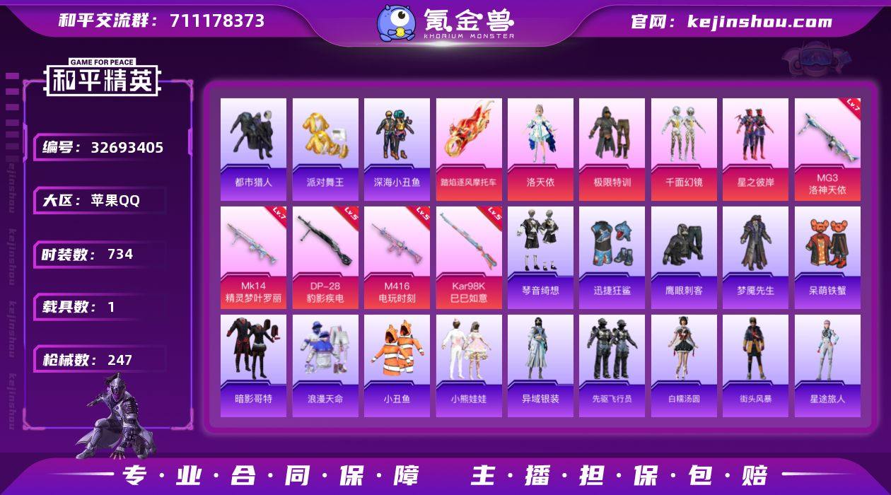 【特价出售】钱包无法注销苹果Q-5稀有1载具4粉装6特效枪16热门185套装247枪皮 70728热力值 6印记 历史传奇王牌10星 【5稀有】 AKM-缤纷海域 都市猎人 浪漫天命 派对舞王 派对舞王(金靴子) 【1载具】 踏焰逐风摩托车 【4粉装】 洛天依 极限特训 千面幻镜 星之彼岸 【6特效枪】 M416-电玩时刻 (5级) Kar98K-巳巳如意 (5级) DP-28-豹影疾电 (5级) Mk14-精灵梦叶罗丽 (7级) MG3-洛神天依 (7级) ACE32-萌骑漫游 (5级) 【16热门】 Mark.06 小丑鱼 龟仙人 梦魇先生 呆萌铁蟹 鹰眼刺客 迅捷狂鲨 深海小丑鱼 暗影哥特 团圆交子 瑞龙福将 漫步者 破蛋小黄鸡 极速红龙 弄潮海豚 M762-瑞龙福将 【1头盔】 深海小丑鱼头盔 【2背包】 萌熊伴侣背包 深海小丑鱼背包