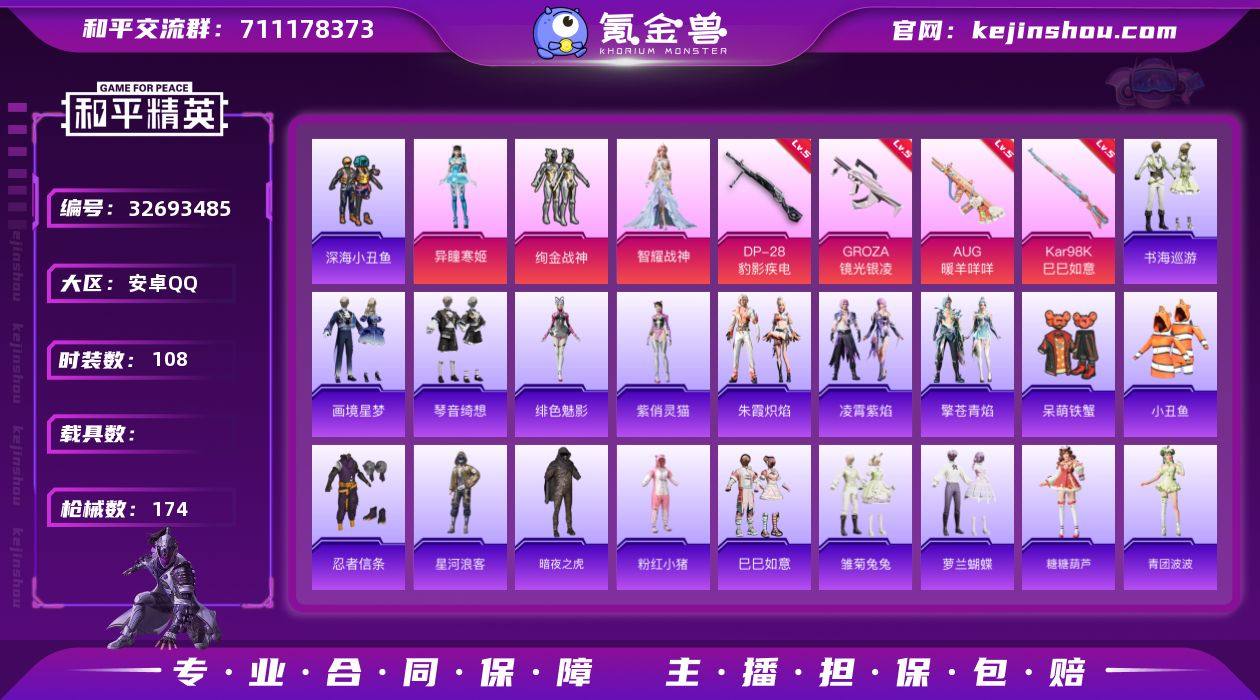 满级地铁安卓 手Q-4粉装-9特效枪-0载具-2粉色飞行器-44039热力值-2王牌印记-108套装-174枪皮 【热门品类】:套装-深海小丑鱼,套装-小丑鱼,套装-忍者信条,套装-星河浪客,套装-暗夜之虎,套装-粉红小猪 【粉色套装】:粉装-绚金战神,角色-智耀战神,角色-异瞳寒姬,角色-鸢尾珑雾 【粉色枪皮等级】:GROZA-镜光银凌(五级),AUG-暖羊咩咩(五级),ACE32-萌骑漫游(二级),UMP45-萌骑冒险(三级),AKS-74U-森灵之息(五级),Kar98K-巳巳如意(五级),Mk14-福马献瑞(五级),AA12-G-萌骑幻想(二级),DP-28-豹影疾电(五级) 【粉色枪皮】:GROZA-镜光银凌,AUG-暖羊咩咩,ACE32-萌骑漫游,UMP45-萌骑冒险,AKS-74U-森灵之息,Kar98K-巳巳如意,Mk14-福马献瑞,AA12-G-萌骑幻想,DP-28-豹影疾电 【粉色飞行器】:炫彩糖果飞行器,星之彼岸飞行器 【粉色降落伞】:幻影战神降落伞,星之彼岸降落伞,千金淑猫降落伞,圣域龙灵降落伞,星穹咏叹调降落伞,时光之誓降落伞,异瞳寒姬降落伞,炫彩糖果降落伞 【稀有套装】:套装-巳巳如意,套装-雪国风尚,套装-炫彩糖果,套装-马上有钱,套装-雏菊兔兔,套装-萝兰蝴蝶,套装-糖糖葫芦,套装-青团波波,套装-棉花软糖,角色-都市丽猫,角色-摩...
