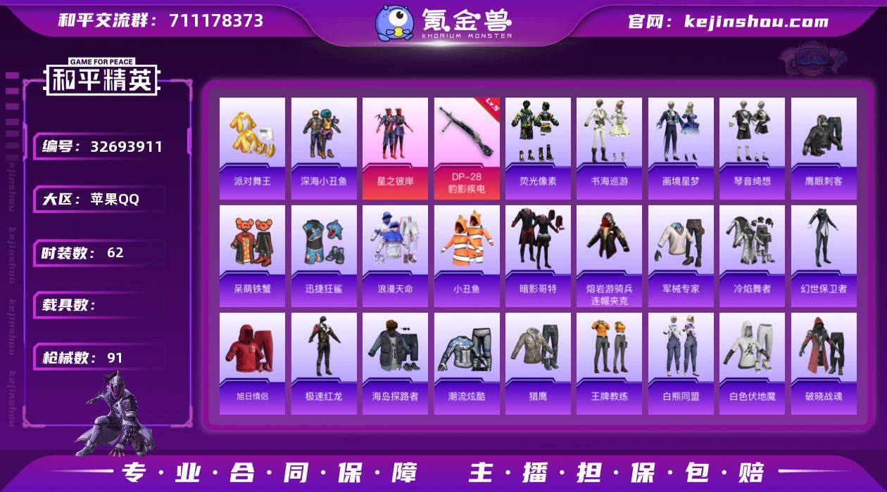眼罩金鞋满级地铁苹果 手Q-1粉装-4特效枪-0载具-1粉色飞行器-22622热力值-2王牌印记-62套装-91枪皮 【热门品类】:套装-浪漫天命,套装-派对舞王,套装-深海小丑鱼,套装-小丑鱼,套装-暗影哥特,熔岩游骑兵连帽夹克 【粉色套装】:粉装-星之彼岸 【粉色枪皮等级】:UMP45-萌骑冒险(三级),Mk14-福马献瑞(五级),AA12-G-萌骑幻想(五级),DP-28-豹影疾电(五级) 【粉色枪皮】:UMP45-萌骑冒险,Mk14-福马献瑞,AA12-G-萌骑幻想,DP-28-豹影疾电 【粉色飞行器】:炫彩糖果飞行器 【粉色降落伞】:绝对恒星降落伞,星之彼岸降落伞,炫彩糖果降落伞,辉云木星降落伞 【稀有套装】:套装-荧光像素,套装-雪国风尚,套装-炫彩糖果,套装-马上来财,套装-迅捷龙虾,套装-书海巡游,套装-画境星梦,套装-琴音绮想,角色-霜刃之御,套装-雨过天青,套装-红釉青花 【稀有枪皮】:AUG-冰晶雪宝,AKM-破晓战魂,AKM-缤纷海域,M16A4-幻世战舞者,SCAR-L-夜灯,M416-红色方程式,M416-蓝色火焰,AUG-甜蜜菠萝,AUG-耀粉歌者,ACE32-画境星梦,UZI-啾咪啾咪,UZI-影袭,UMP45-夜灯,UMP45-生命誓言,汤姆逊-像素花束,MP5K-画境星梦,AKS-74U-荧光像素,SKS-金玉无双,Mini14-穿刺龙虾,M1加...