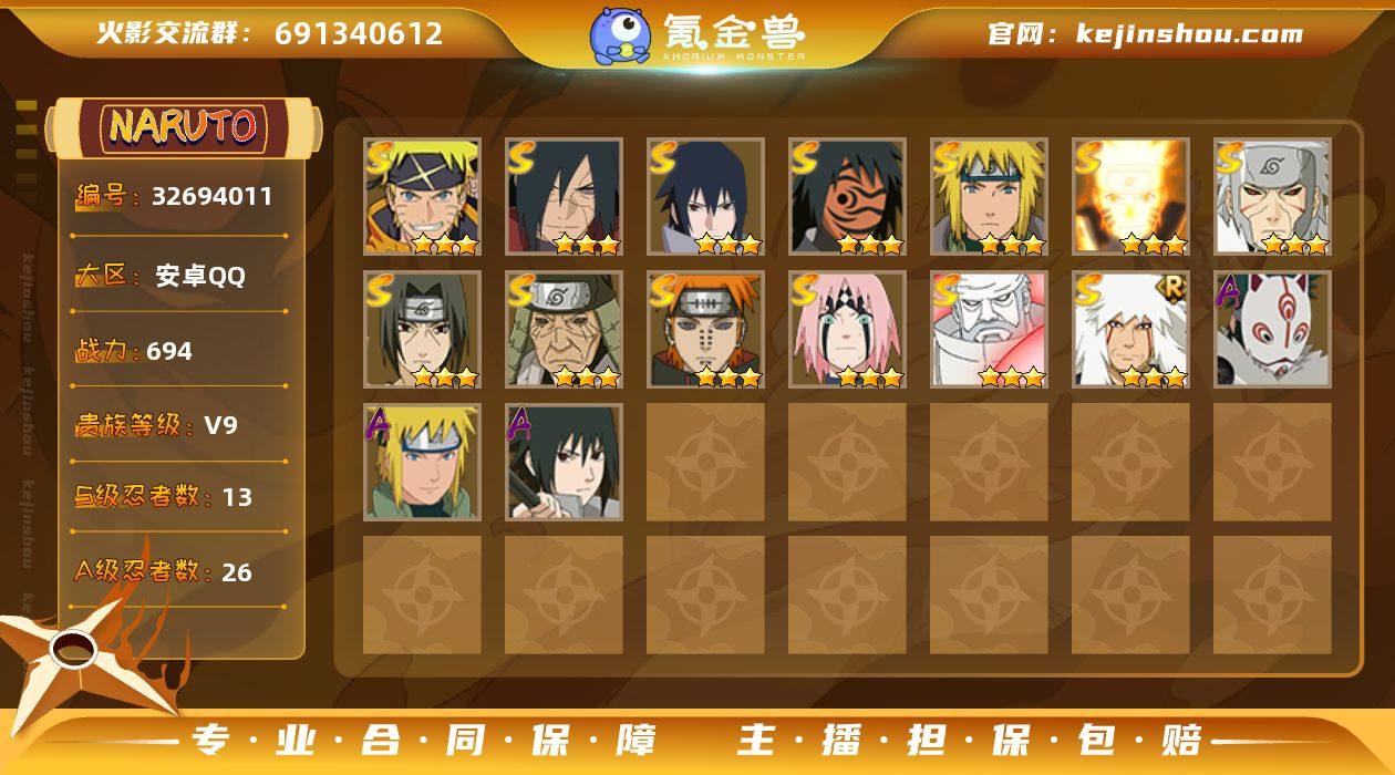【火影忍者】战斗力:694W+;段位:见习3阶;本服排名:1478;VIP:V9级;S忍:13个;A忍:26个;通灵兽:16个,S忍:秽土转生解宇智波斑|秽土转生千手扉间|天道佩恩|漩涡鸣人宇智波佐助|永恒万花筒宇智波佐助|舞之豪杰自来也|波风水门|须佐能乎宇智波鼬|红夜之刃神秘面具男|忍界大战春野樱|九喇嘛连结漩涡鸣人|博人传大筒木金式|秽土转生猿飞日斩__A忍:幻之真容旗木卡卡西|忍界大战李洛克|忍界大战日向宁次|四代目土影黑土|青年长门|忍者之路神秘面具男|秽土转生迪达拉|青年波风水门|青年艾|近松十人卫千代|须佐能乎宇智波佐助|九尾查克拉漩涡鸣人|忍界大战秋道丁次|五代目水影照美冥|死司凭血飞段|疾风传我爱罗 * 3星|迪达拉(普通)|飞段(普通)|迈特凯(普通) * 5星|宇智波鼬(普通)|干柿鬼鲛(普通) * 5星|蝎(普通)|猿飞阿斯玛(普通) * 5星|桃式显现漩涡博人|六代目水影长十郎|宇智波泉奈__通灵兽:忍犬(普通)|蓝蛇|蛤蟆吉|砂之守鹤|忍龟|镰鼬|猿魔|山椒鱼|蛞蝓(普通)|蜃|蛤蟆仙人|鲛鲨|蛤蟆健|乌鸦(普通)|蛤蟆龙|蛤蟆广