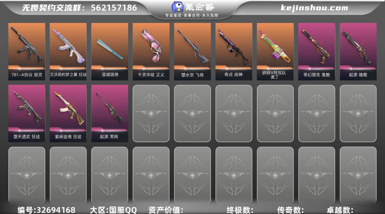 【游戏等级】Lv150 【段位】未定级 【R点】1,210 【皮肤总价值】35,260 【英雄数量】28 【皮肤数量】88 【挂饰数量】90 【卡面数量】126 【喷漆数量】102 【标配】标配-星际猎兵 标配-荒土机兵 标配-浮光跃金 标配-超能偶像 标配-VCTxBLG 标配-战术熊与伙伴们 【正义】正义-日耀风暴 正义-纳米打击 正义-超限闪存 正义-RGX11zPro//3.0 正义-千灵华绽 正义-纤云弄巧 【狂徒】狂徒-艾沃莉的梦之翼 狂徒-塑水宗 狂徒-荒土机兵 狂徒-紫阙金琅 狂徒-混沌序曲 狂徒-超能偶像 狂徒-流星兵团 狂徒-盖亚的复仇 狂徒-堕天遗武 【鬼魅】鬼魅-星云暗涌 鬼魅-模拟赫兹 鬼魅-采蜜小蜂队 鬼魅-流星兵团 鬼魅-奇幻朋克 【判官】判官-毁灭骑士 判官-纳米打击 判官-采蜜小蜂队 判官-超能偶像 【幻影】幻影-黯夜怪谈 幻影-纳米打击 幻影-超限闪存 幻影-聚合之力 幻影-洪荒怒焰 【近战武器】近战武器-荒土机兵热能刀 近战武器-超限闪存匕首 近战武器-超能偶像应援棒 近战武器-RGX11zPro//3.0爪刀 近战武器-流星兵团短剑 近战武器-澄湖潋滟 【冥驹】冥驹-荒土机兵 冥驹-模拟赫兹 冥驹-起源 冥驹-复古浪潮 【骇灵】骇灵-荒土机兵 骇灵-浮光跃金 骇灵-781-A协议 骇灵-流星兵团 骇灵-珍珠棘贝 【獠犬】...