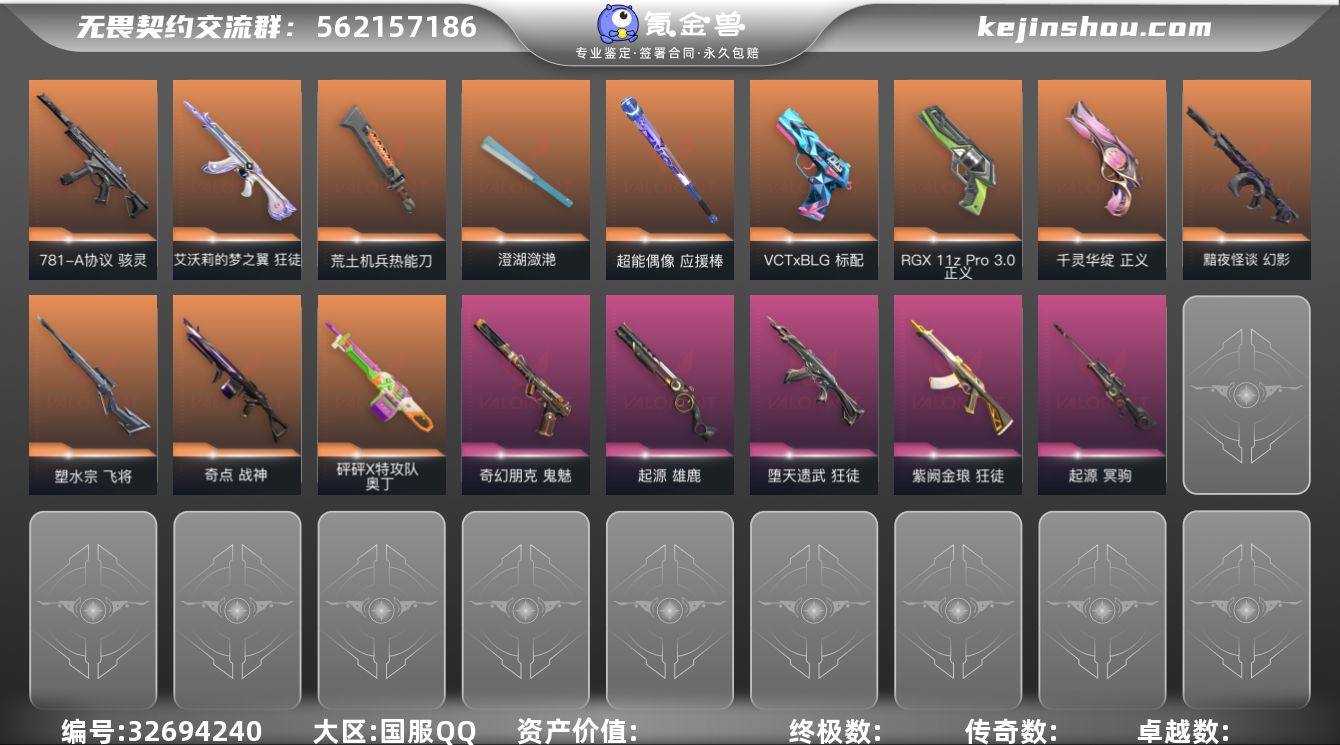 【游戏等级】Lv150 【段位】未定级 【R点】1,210 【皮肤总价值】35,260 【英雄数量】28 【皮肤数量】88 【挂饰数量】90 【卡面数量】126 【喷漆数量】102 【标配】标配-星际猎兵 标配-荒土机兵 标配-浮光跃金 标配-超能偶像 标配-VCTxBLG 标配-战术熊与伙伴们 【正义】正义-日耀风暴 正义-纳米打击 正义-超限闪存 正义-RGX11zPro//3.0 正义-千灵华绽 正义-纤云弄巧 【狂徒】狂徒-艾沃莉的梦之翼 狂徒-塑水宗 狂徒-荒土机兵 狂徒-紫阙金琅 狂徒-混沌序曲 狂徒-超能偶像 狂徒-流星兵团 狂徒-盖亚的复仇 狂徒-堕天遗武 【鬼魅】鬼魅-星云暗涌 鬼魅-模拟赫兹 鬼魅-采蜜小蜂队 鬼魅-流星兵团 鬼魅-奇幻朋克 【判官】判官-毁灭骑士 判官-纳米打击 判官-采蜜小蜂队 判官-超能偶像 【幻影】幻影-黯夜怪谈 幻影-纳米打击 幻影-超限闪存 幻影-聚合之力 幻影-洪荒怒焰 【近战武器】近战武器-荒土机兵热能刀 近战武器-超限闪存匕首 近战武器-超能偶像应援棒 近战武器-RGX11zPro//3.0爪刀 近战武器-流星兵团短剑 近战武器-澄湖潋滟 【冥驹】冥驹-荒土机兵 冥驹-模拟赫兹 冥驹-起源 冥驹-复古浪潮 【骇灵】骇灵-荒土机兵 骇灵-浮光跃金 骇灵-781-A协议 骇灵-流星兵团 骇灵-珍珠棘贝 【獠犬】...