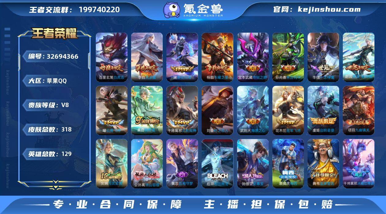 V8 1典藏 15传说 318皮肤 129英雄 【1水晶】【15传说】百里玄策-白虎志,干将莫邪-久胜战神,宫本武藏-地狱之眼,花木兰-冠军飞将,李白-凤求凰,李信-一念神魔,刘备-时之恋人,孙尚香-末日机甲,武则天-海洋之心,杨戬-永曜之星,虞姬-启明星使,赵云-乘龙·铭钟鼎,澜-逐花归海,曜-云鹰飞将,桑启-鸣野蒿【88史诗】阿轲-暗夜猫娘,阿轲-节奏热浪,阿轲-迷踪丽影,安琪拉-心灵骇客,白起-星夜王子,百里守约-特工魅影,百里守约-朱雀志,百里玄策-原初追逐者,不知火舞-魅语,蔡文姬-舞动绿茵,曹操-幽灵船长,程咬金-功夫厨神,妲己-女仆咖啡,妲己-魅力维加斯,狄仁杰-魔术师,狄仁杰-鹰眼统帅,典韦-蓝屏警告,貂蝉-圣诞恋歌,貂蝉-逐梦之音,伽罗-箭羽风息,干将莫邪-冰霜恋舞曲,公孙离-无限星赏官,宫本武藏-鬼剑武藏,关羽-冰锋战神,韩信-白龙吟,花木兰-水晶猎龙者,花木兰-青春决赛季,花木兰-瑞麟志,橘右京-修罗,铠-曙光守护者,兰陵王-暗隐猎兽者,兰陵王-驯魔猎人,李白-千年之狐,李元芳-逐浪之夏,李元芳-银河之约,廉颇-地狱岩魂,刘邦-德古拉伯爵,刘禅-绅士熊喵,露娜-紫霞仙子,露娜-一生所爱,鲁班七号-狮舞东方,吕布-圣诞狂欢,吕布-御风骁将,马超-神威,马可波罗-暗影游猎,马可波罗-逐梦之星,蒙犽-狂想玩偶喵...