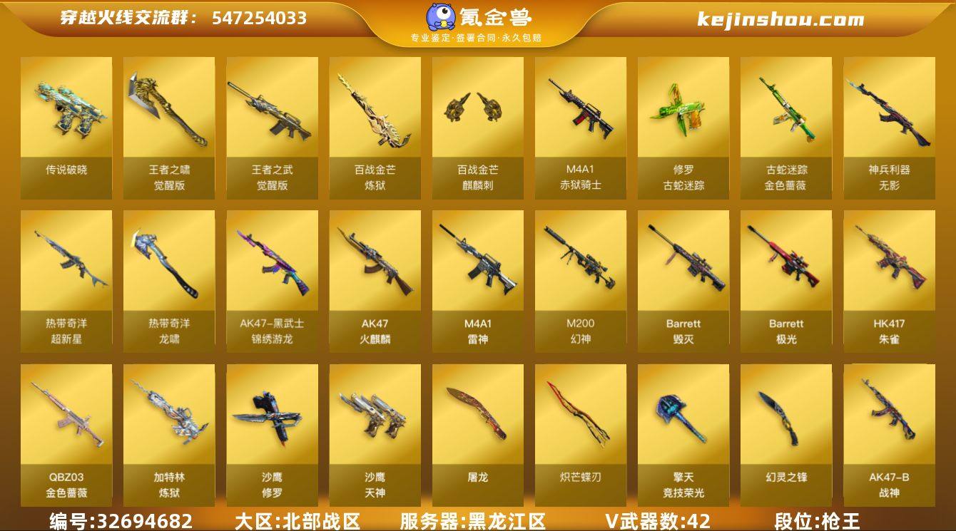 【ky3840】黑龙江区-44V-6王者-0炫金 【传说武器】:传说破晓 【热门武器】:传说破晓,QBZ03-金色蔷薇,HK417-朱雀,M200-幻神,金色蔷薇-古蛇迷踪,修罗-古蛇迷踪,加特林-炼狱,沙鹰-修罗*2,炽芒蝶刃 【音效卡】:天神-动感闪耀 音效卡,M200-幻神音效卡,Barrett-碧霄极光音效卡,炼狱-百战金芒-庆典舞曲音效卡 【皮肤】:幻神-CFS2022,幻神-动感闪耀 皮肤,幻神-电竞之星 皮肤,雷神-荣耀之魄,雷神-维纳斯皮肤,雷神-动感闪耀 皮肤,雷神-源计划2.0专属 皮肤,M4A1-再燃火线,火麒麟-轻羽皮肤,火麒麟-心动糖果,黑龙-暗月,战神-粉色甜心皮肤,AK47-B-常胜将军-刘备,屠龙-星火燎原,轻型军用手斧-再燃火线 【角色】:王者樱-热浪之夏,王者炫,蛇隐宗,奇洋探员,乔伊教练,暗夜-X,初恋灵狐,芳心审判者,嘉年华灵狐,灵狐者-X,灵狐者-黄金海岸,龙儿,麻雀,曼陀罗-X,潘多拉-X,潜龙队-X,蛇姬,斯沃特-X,维纳斯,游珑儿 【人偶武器】:M4A1-雷神-精英刀锋,海滩汪汪-巴雷特,迷你牛牛,深渊终结者手雷,迷你超能女侍 【挑战大师】:AK47-冰龙粉碎者,神圣爆裂者-末日III 【英雄级武器】:AK47-火麒麟,M4A1-雷神*2,HK417-朱雀,无影-神兵利器,黑武士-锦绣游...