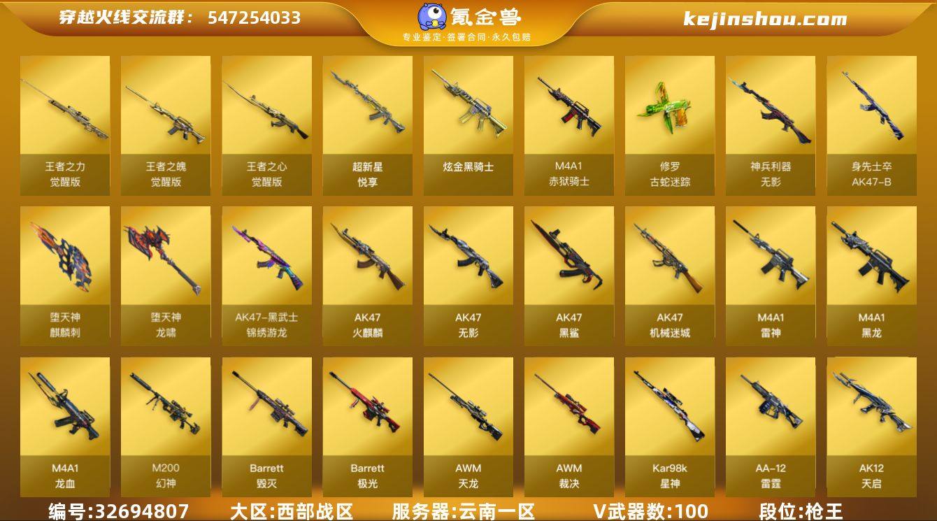 云南一区-104V-4王者武器数-3炫金武器数 【热门武器】:QBZ03-金色蔷薇,M200-幻神*2,修罗-古蛇迷踪,死亡之眼,Kar98K-星神,汤姆逊-烈龙*4,RPK-盘龙,加特林-炼狱*4,火麒麟-绝迹,COP-白鲨,沙鹰-修罗*6,金刚伞 【王者炫金武器】:超新星-悦享,炫金骑士*3 【音效卡】:AK47-火麒麟音效卡,M4A1-雷神音效卡,Barrett-毁灭音效卡,Barrett-极光音效卡,绝迹语音包 【皮肤】:幻神-周瑜皮肤,星神-破竹皮肤,烈龙-星空,雷神-星空,雷神-蓝风铃 皮肤,火麒麟-雷神,AK47-火麒麟-传奇EVEN,火麒麟-心动糖果,毁灭耀金皮肤,毁灭-星空,毁灭-英雄计划 皮肤,M4A1-千变-孔明皮肤,黑龙-能量核心,无影耀金皮肤,AK47-B-常胜将军-刘备,天龙-能量核心,修罗-能量核心 【角色】:炫,蛇隐宗,乔伊教练,暗夜-X,初恋灵狐,芳心审判者,嘉年华灵狐,娟娟,灵动武士,曼陀罗-礼服,潘多拉-X,潘多拉-甜心教官,潜龙队-X,邱刚敖,蛇姬,斯沃特-X,蜀雪,铁骑荣耀,兔囡囡,王者-零-传说之路,职业选手 【人偶武器】:火麒麟-绝迹,COP-白鲨,火麒麟-灵狐,M4A1-雷神-精英刀锋,AWM-灵狐-15周年嘉年华,M37-葵,闪光弹-小乔 【暴走生化】:死亡之眼,超级对讲机 【挑战大师】:冰...