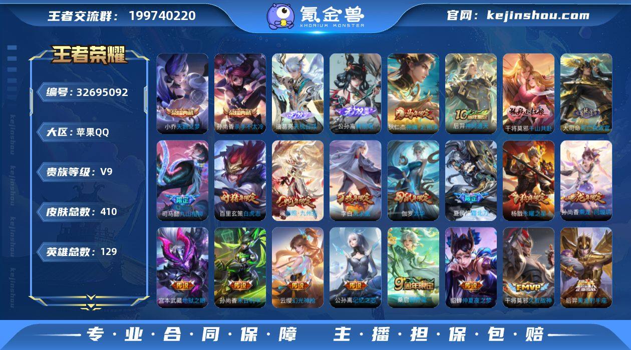 连体和平 苹果Q-V9-最强王者段位-129英雄-410皮肤-2典藏皮肤-1典藏英雄-2无双-27传说-123史诗 【英雄全皮】:司马懿全皮,孙权全皮,苍全皮,敖隐全皮,莱西奥全皮,空空儿全皮 【荣耀典藏】:武则天英雄,小乔天鹅之梦,孙尚香杀手不太冷 【无双皮肤】:诸葛亮天机白泽,公孙离离恨烟 【传说皮肤】:狄仁杰神骥赴朔漠,后羿神树通天,干将莫邪千山共赴,大司命死亡执政官,司马懿九山相柳,澜愿照九州拓,云缨幻光神枪,桑启鸣野蒿,夏侯惇霜北刀,孙尚香乘龙问璇玑,公孙离记忆之芯,百里守约碎云,铠绛天战甲,虞姬启明星使,伽罗太华,貂蝉猫影幻舞,干将莫邪久胜战神,虞姬云霓雀翎,百里玄策白虎志,后羿黄金射手座,杨戬永曜之星,貂蝉仲夏夜之梦,李白凤求凰,孙尚香末日机甲,宫本武藏地狱之眼,孙悟空地狱火,武则天海洋之心 【限定皮肤】:白起狰,公孙离离恨烟,夏侯惇霜北刀,虞姬夏日便利店,姜子牙天穹之誓,狄仁杰阴阳师,虞姬凯尔特女王,赵云皇家上将,妲己热情桑巴,妲己时之彼端,嬴政白昼王子,孙尚香蔷薇恋人,鲁班七号狮舞东方,庄周蜃楼王,高渐离死亡摇滚,阿轲迷踪丽影,孙膑妖精王,扁鹊炼金王,芈月重明,吕布猎兽之王,周瑜赤莲之焰,元歌云间偶...