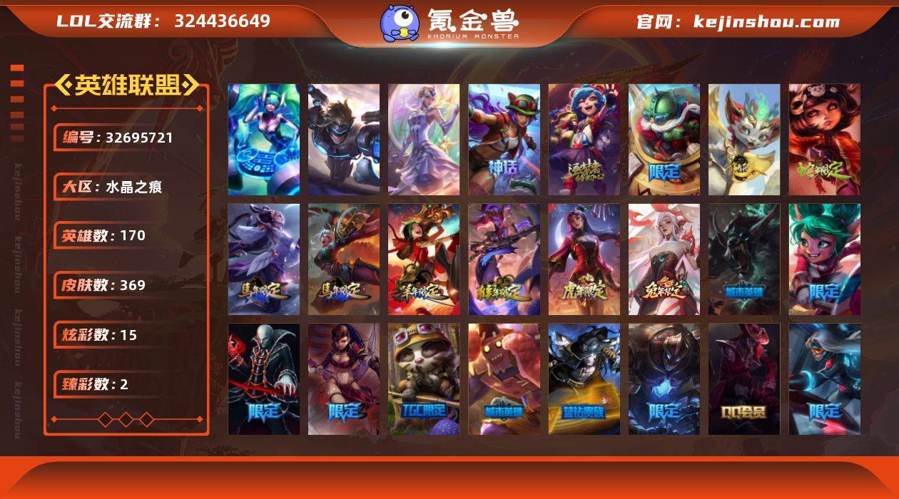 【皇冠号】未定级段位-170英雄-369皮肤-15炫彩-3终极-2神话-69限定-30传说-87史诗 【珍稀头像】:红包头像 【热门头像】:卡特琳娜的匕首头像 【神话皮肤】:十周年纪念安妮,十五周年纪念希维尔 【臻彩皮肤】:玉剑传说神机花火青竹,黑夜使者嘉文四世白夜 【年限皮肤】:你看见过我的熊猫吗安妮,替父从军花木兰,广寒仙子嫦娥,神龙烈焰金克丝,玉净夜叉凯特琳,烈焰仙子黛安娜,剪纸仙灵艾瑞莉娅,天龙之子斯莫德 【情人节限定】:觅心猎手薇恩,觅心女王艾希 【冰雪限定】:幸福女神乐芙兰,圣诞开心鬼提莫,圣诞精灵崔丝塔娜,圣诞狂欢努努和威朗普,圣诞糖果棒厄运小姐,阿木木“主人不要我了”,胡桃夹子萨科,平安夜女神娑娜,英勇玩具兵普朗克,喜庆之树茂凯,冬季仙境奥莉安娜,雪默丁格,雪装奈德丽,圣诞玩偶波比,圣诞老人古拉加斯,魄罗骑士瑟庄妮,雪球也能爆炸吉格斯 【终极皮肤】:大元素使拉克丝,DJ娑娜,未来战士伊泽瑞尔 【限定皮肤】:钢铁军团拉克丝,诺斯费拉图弗拉基米尔,冠军之刃锐雯,冠军典狱长锤石,冠军之刃锐雯2016,暗杀星蒙多,暗杀星努努和威朗普,SKTT1劫,SKTT1李青,SSW辛吉德,SSW泰隆,SSW雷恩加尔,SSW锤石,DRX艾希,电玩勇者锐雯,...