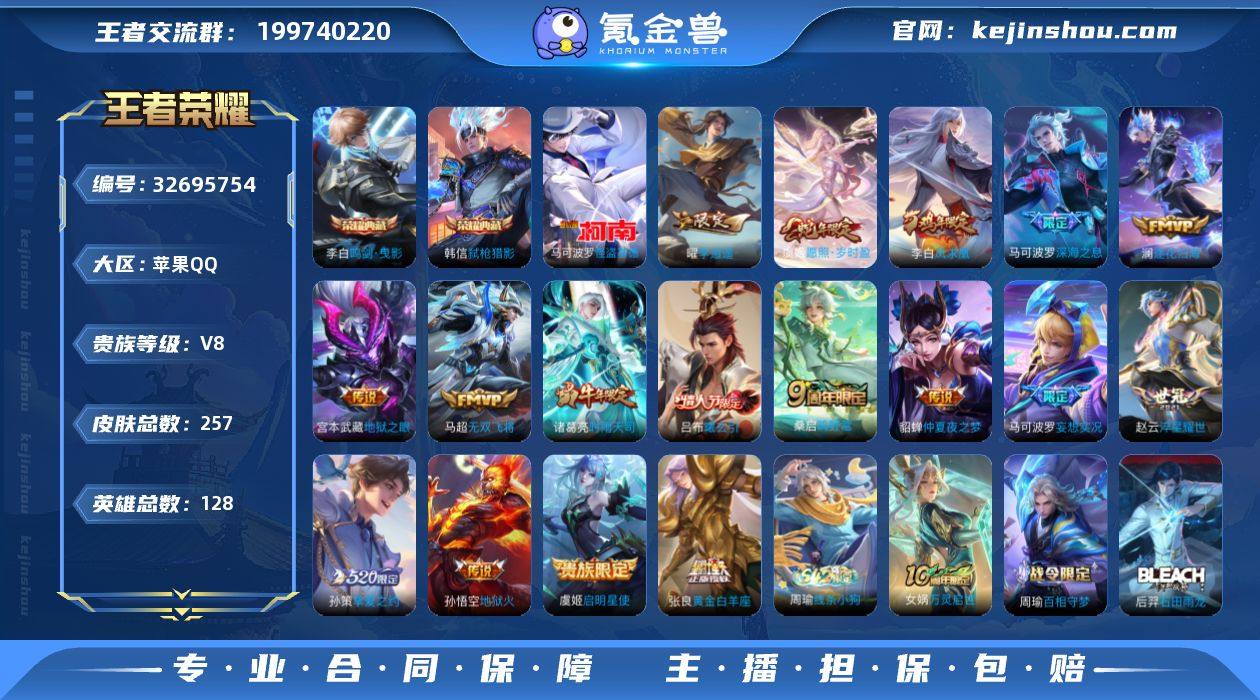 苹果Q-V8-至尊星耀II段位-128英雄-257皮肤-2典藏皮肤-1珍品传说-17传说-76史诗 【英雄全皮】:孙权全皮,狂铁全皮,敖隐全皮,戈娅全皮,海诺全皮 【荣耀典藏】:李白鸣剑曳影,韩信弑枪猎影 【珍品传说】:马可波罗怪盗基德 【传说皮肤】:虞姬愿照岁时盈,桑启鸣野蒿,吕布曦玄引,澜逐花归海,马可波罗妄想实况,马可波罗深海之息,马超无双飞将,孙策挚爱之约,赵云淬星耀世,曜李逍遥 ,诸葛亮时雨天司,虞姬启明星使,张良黄金白羊座,貂蝉仲夏夜之梦,李白凤求凰,宫本武藏地狱之眼,孙悟空地狱火 【限定皮肤】:狄仁杰阴阳师,赵云皇家上将,庄周高山流水,高渐离玩趣恶龙,阿轲迷踪丽影,夏侯惇朔风刀,甄姬游园惊梦,典韦穷奇,典韦蓝屏警告,马可波罗暗影游猎,马可波罗深海之息,马可波罗妄想实况,狄仁杰魔术师,狄仁杰万华元夜,达摩沙漠行僧,项羽海滩派对,老夫子醍醐杖,程咬金演武夺筹,韩信傲雪梅枪,兰陵王金庭之子,孙悟空至尊宝,孙悟空大圣娶亲,牛魔御旌,后羿辉光之辰,李元芳云中旅人,虞姬启明星使,钟馗驱傩正仪,雅典娜黎明之约,鬼谷子原初探秘者,鬼谷子五谷丰年,诸葛亮时雨天司,苏烈千军破阵,百里玄策原初追逐者,弈星混沌棋,梦奇顽趣,...