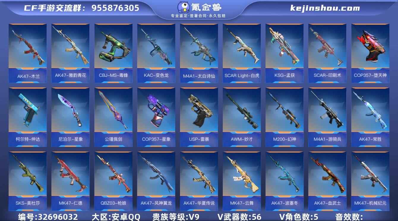 x1707 VIP9,王者武器22,英雄级武器219,万化571,角色22 【王者武器】:怒至尊/心至尊/魄至尊/幻至尊/狱至尊/王者之心/王者之影/王者之翼/王者之魄/王者之兽/王者之怒/王者幻神/王者之神/王者之狱/王者之蝶/M12S-雷霆王者/王者之魂/王者之迹/王者之锋/王者之心手雷/王者之圣手雷/王者之心闪光弹/王者之圣闪光弹/王者之兽闪光弹/王者之心烟雾弹/王者之圣烟雾弹/王者之兽烟雾弹 ;【热门皮肤】:尼泊尔-星象-璀璨星辰·青龙/M4A1-仲达-过载/屠龙-星空/虚空之槌-妙才-过载/沙鹰-无影-暗月/屠龙-英雄战甲/龙啸-英雄战甲/AK47-无影-英雄战甲/擎天觉醒-现代金属/沙鹰-修罗-现代金属/M4A1-黑骑士-瑞兽/AK47-华夏传说-起源/AK47-火麒麟-不屈老兵/M4A1-竞技战魂-情久/M4A1-竞技战魂-AG/王者之心闪光弹-HeartShot/火麒麟烟雾弹-能量核心/沙鹰-无影-不屈老兵/巴雷特-极光-清凉夏日/双持柯尔特-极光-清凉夏日/丈八蛇矛-怒魔/王者之翼-冰霜奇迹/巴雷特-毁灭-EP/AK47-无影-诸神黄昏/AK47-黑武士觉醒-金属蜂巢/巴雷特-极光-尼尔/改装GLOCK-黑龙-暗月/M4A1-游骑兵-KZ/气手枪-炼狱-怒魔/王者之迹-冰霜奇迹/屠龙-枪圣之锋/丛林匕首-死神-能量核心/巴雷特-极光-英雄战甲/王者之怒-HeartShot/AK47-无...