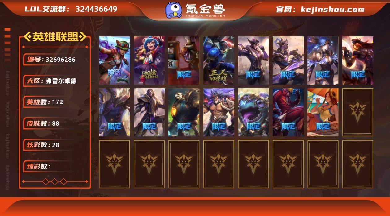 铂金段位-172英雄-88皮肤-28炫彩-0终极-2神话-18限定-6传说-25史诗 【神话皮肤】:十周年纪念安妮,十五周年纪念希维尔 【冰雪限定】:圣诞狂欢基兰 【限定皮肤】:SKTT1李青,暗裔英雄盖伦,胜利女神希维尔,胜利之剑亚托克斯,胜利枪神卢锡安,胜利机器人布里茨,胜利之王泰达米尔,胜利巨口克格莫,胜利女神娑娜,胜利剑圣易,胜利之运崔斯特,胜利女神菲奥娜,海贼瑞兹,泳池派对蕾欧娜,防暴士兵辛吉德,防暴天使凯尔 【传说皮肤】:合金巨兽努努和威朗普,女皇艾希,战地巨兽科加斯,电玩女神娑娜,源计划净化薇恩,炼狱魔犬内瑟斯 【史诗皮肤】:特战先锋赵信,天人合一易,战争机器赛恩,战场公主希维尔,火箭达人崔丝塔娜,紫晶射手艾希,百夫长贾克斯,炼金狂士辛吉德,死神卡尔萨斯,特种部队普朗克,抵抗军天使凯特琳,至高之拳李青,屠龙勇士薇恩,法老王朝内瑟斯,军神战甲波比,奥术光辉拉克丝,ODST地狱伞兵拉克丝,银河魔装机神希瓦娜,银河魔装机神菲兹,驯龙女巫璐璐,铁血帝皇德莱厄斯,生化骑士德莱厄斯,亚特兰蒂斯辛德拉,时之砂艾克,上古战魂雷克塞 【勇士皮肤】:亮丽女神希维尔 【其他皮肤】:小红帽安妮,弗拉基米尔侯爵,波江星神弗拉基米尔,森...