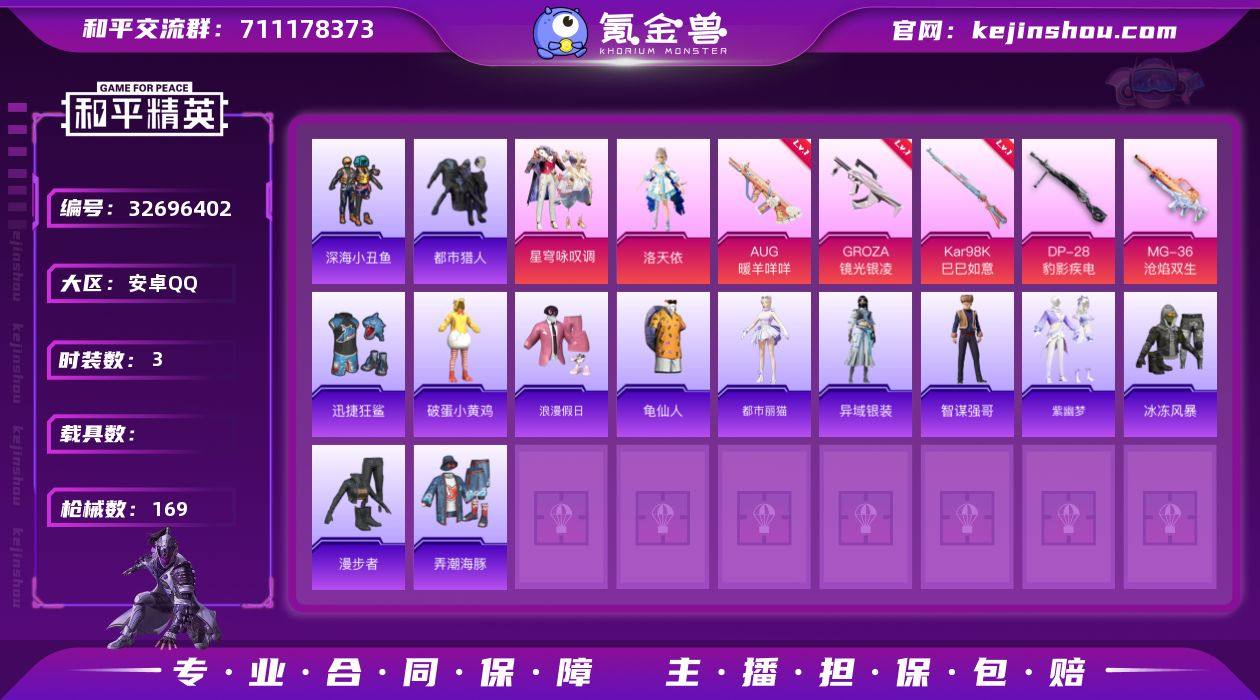 DSH2328【身法号3粉装-12特效枪 洛天依 深海小丑鱼,都市猎人 AUG-暖羊咩咩[5级]】安卓手Q-3粉装-12特效枪-117套装-169枪皮-13王牌印记-超级王牌-52011热力值【3粉装】星穹咏叹调,角色-洛天依,角色-月影灵韵【12特效枪】AKS-74U-森灵之息[5级],Mk14-福马献瑞[4级],Kar98K-巳巳如意[5级],ACE32-萌骑漫游[4级],AUG-暖羊咩咩[5级],DP-28-豹影疾电[5级],M762-青锋波束[5级],MG-36-沧焰双生[5级],AA12-G-萌骑幻想[4级],GROZA-镜光银凌[5级],UMP45-萌骑冒险[4级],Mk14-甜梦熊击[5级]【4稀有】深海小丑鱼,都市猎人,M416-黄金龙骨,AWM-黄金龙骨【11飞行器】顶峰精英尾迹,马上有福飞行器,空岛之星尾迹,光之冒险尾迹,登顶巅峰飞行器,炫彩糖果飞行器,异域银装飞行器,冰柠泡泡飞行器,破刃行动尾迹,鸡智如我飞行器,荒原烈焰飞行器【2头盔】金羽特工头盔,深海小丑鱼头盔【3背包】金羽特工背包,深海小丑鱼背包,百万伏特背包【267其它衣服和枪皮】角色-银尘,SS35特训,虎虎生威吉莉,SS28特训,特战装甲,SS25特训,SS37特训,锦衣飞扬,鱼渊荷华,画境星梦,顶瓜瓜,角色-紫俏灵猫,SS33特训,源星混沌,SS29特训,福马献瑞,长空猛禽,燕燕于飞,巳巳如意,玩偶服-美羊羊,黑色伏地魔,人气偶像,惊鸿侠骨,魅力单车...