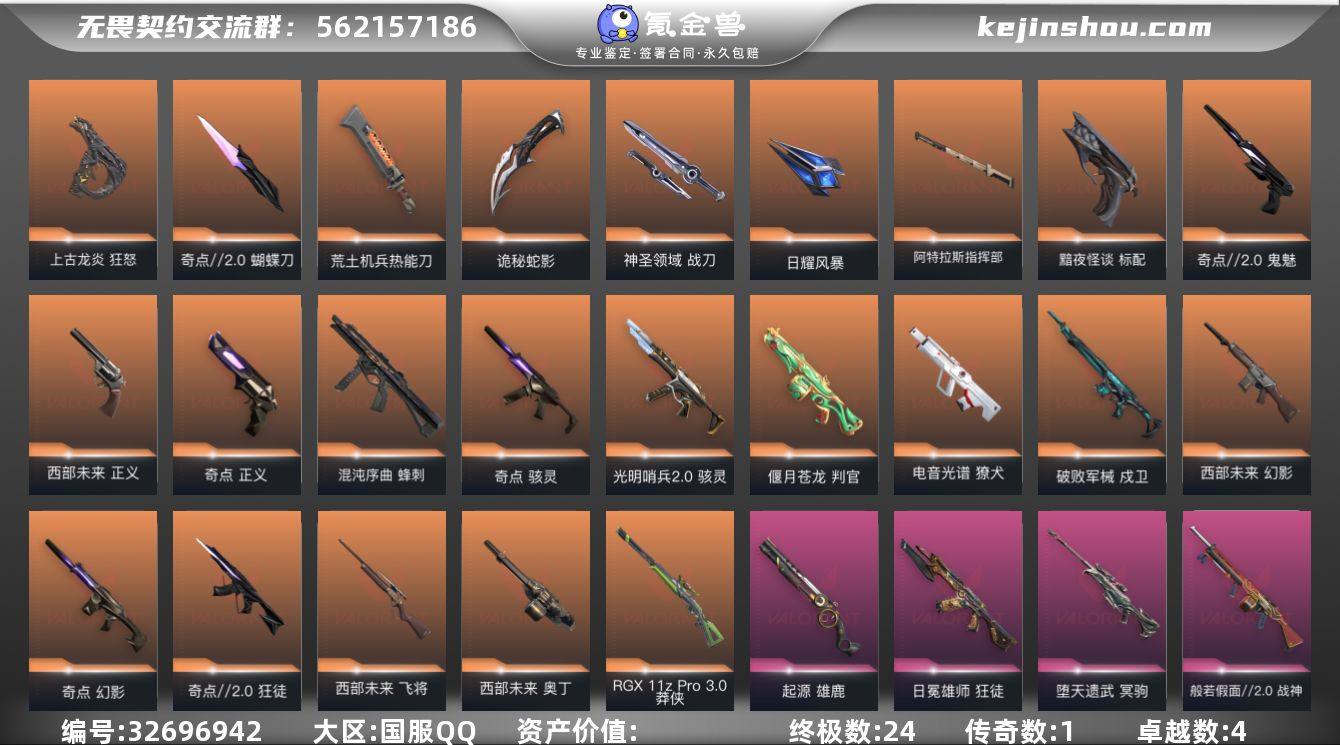 【qyz9357】西部 奇点 还有特效皮 喜欢的来吧 qyz9357 【近战武器】:近战武器-奇点//2.0 蝴蝶刀,近战武器-威龙之刃,近战武器-未来开拓者,近战武器-荒土机兵 热能刀,近战武器-诡秘蛇影 军刀,近战武器-神圣领域 战刀,近战武器-日耀风暴 遗器,近战武器-阿特拉斯指挥部 甩棍 【狂徒】:狂徒-奇点//2.0,狂徒-日冕雄师,狂徒-荒土机兵,狂徒-诡秘蛇影 【幻影】:幻影-奇点,幻影-西部未来,幻影-神圣领域,幻影-纳米打击,幻影-末日之翼,幻影-西部未来 【戍卫】:戍卫-破败军械,戍卫-逆冲蛮牛,戍卫-月球哨兵,戍卫-折光棱晶 【獠犬】:獠犬-电音光谱,獠犬-神圣领域,獠犬-逆冲蛮牛,獠犬-电音光谱 【冥驹】:冥驹-堕天遗武,冥驹-荒土机兵,冥驹-星云暗涌 【飞将】:飞将-西部未来,飞将-末日之翼 【莽侠】:莽侠-RGX 11z Pro//3.0,莽侠-诡秘蛇影,莽侠-月球哨兵 【战神】:战神-般若假面//2.0,战神-神圣领域 【奥丁】:奥丁-西部未来,奥丁-纳米打击,奥丁-末日之翼 【判官】:判官-偃月苍龙,判官-诡秘蛇影,判官-纳米打击x 【雄鹿】:雄鹿-起源,雄鹿-逆冲蛮牛,雄鹿-月球哨兵 【骇灵】:骇灵-光明哨兵//2.0,骇灵-奇点,骇灵-荒土机兵,骇灵-星云暗涌 【蜂刺】:...