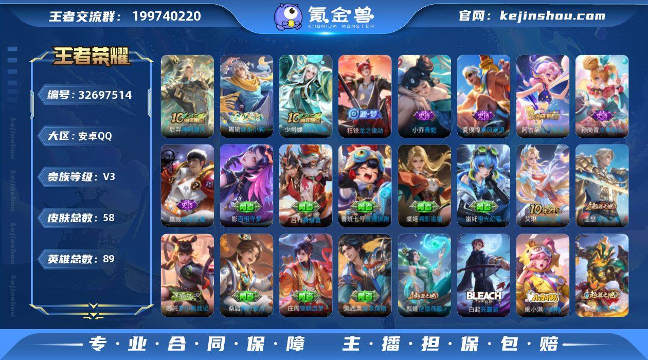安卓Q-V3-至尊星耀III段位-89英雄-58皮肤-1传说-7史诗 【传说皮肤】:后羿神树通天 【限定皮肤】:狄仁杰阴阳师,阿古朵江河有灵,沈梦溪龙舞盛年 【赛季限定】:钟馗虚灵犬护,甄姬逆浪荇歌,亚瑟荣光之誓 【战令限定】:周瑜线条小狗 【史诗皮肤】:周瑜线条小狗,少司缘巫礼祀神,狂铁龙之律动,阿古朵江河有灵,小乔青蛇,夏侯惇乘风破浪,嬴政摇滚巨星,孙尚香水果甜心 【其他皮肤】:影百相守梦,吕布舞狮寰,鲁班七号班班快跑,虞姬溯影追猎,蚩奼极光幻客,艾琳鹤鸣心笺,亚瑟荣光之誓,哪吒罗小黑战记,桑启青衿临川,莱西奥踏浪烽翎,庄周锦麟游梦,甄姬逆浪荇歌,白起死霸装,姬小满小满鸭,钟馗虚灵犬护,大司命暗都幽影,沈梦溪龙舞盛年,朵莉亚金色潮汐,海诺时空谍影,钟无艳海滩丽影,狄仁杰阴阳师,宫本武藏万象初新,亚瑟死亡骑士,姜子牙时尚教父,安琪拉玩偶对对碰,扁鹊救世之瞳,赵云白执事,桑启画中游,金蝉前尘,云缨赤焰之缨,瑶森,盘古创世神祝,米莱狄精准探案法,公孙离花间舞,明世隐占星师,铠龙域领主,黄忠芝加哥教父,哪吒三太子,夏侯惇战争骑士,蔡文姬蔷薇王座,李元芳特种部队,后羿精灵王,小乔万圣前夜,狄仁杰锦衣卫,王昭君精灵公...