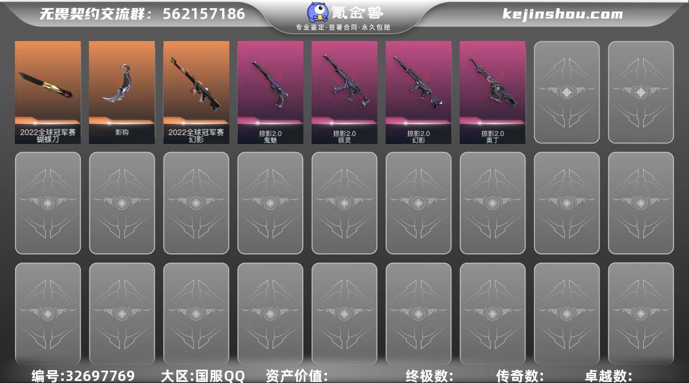 【蝴蝶刀+爪子刀 2热门套装】精品手慢无系列!【可秒换绑 自带包赔】Q193557 (2022全球冠军赛套装/掠影//2.0套装)无畏契约/等级32/未定级/英雄15/皮肤7/资产14010/已使用R点200/剩余R点20/2022全球冠军赛-幻影,2022全球冠军赛-蝴蝶刀,掠影//2.0-幻影,掠影//2.0-奥丁,掠影//2.0-骇灵,掠影//2.0-鬼魅,影钩