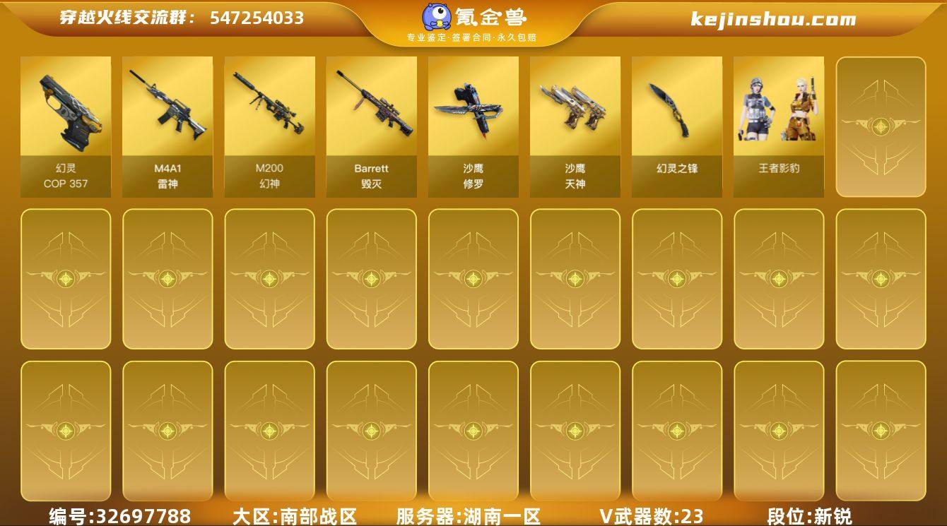 湖南一区-23V-0王者武器数-0炫金武器数 【热门武器】:M200-幻神,COP 357-幻灵,沙鹰-修罗*2 【角色】:王者影豹,云海玲珑,风暴女,娟娟,潘多拉-X 【暴走生化】:超级对讲机 【挑战大师】:冰龙粉碎者-白马银枪,激光毁灭者III-白马银枪 【英雄级武器】:M4A1-雷神,Barrett-毁灭,M200-幻神,沙鹰-修罗*2,沙鹰-天神*2,COP 357-幻灵,幻灵之锋,高爆手雷-幻灵*5,闪光弹-幻灵*5,烟雾弹-幻灵*4 【源级武器】:源·火麒麟*2,AK47-火麒麟-猫爪,御·黑龙-龙太子*2,源·雷神*3,魂·雷神-新春神龙,魂·雷神-萌柴,魂·黑骑士-幻能朋克*2,魂·黑骑士-破浪10年*2,御·黑骑士-冰魄,御·黑骑士·哪吒闹海,灵·黑骑士-破界 I,御·超新星-圣诞,源·机械迷城,魂·龙血-锋芒破茧,魂·HK417-朱雀-凤灵,源·天龙*2,魂·裁决-凤灵*3,源·毁灭,魂·毁灭-航天科技,魂·毁灭-神秘黑洞,御·毁灭-黑大圣,魂·Barrett-朱雀- 新春神龙*2,魂·炼狱-玩具枪,魂·炼狱-月*2,魂·天神-阿努比斯,魂·屠龙-春桃,魂·擎天-破浪10年,源·龙啸,魂·麒麟刺-神秘黑洞 【道具】:炫彩背包,救世主-黑桃战神,绿色巨人,灵魂忍者,迷雾幽灵,夺命之镰,防化服*2,金色流光-枪王排位,星辰流光-枪王排位,枪王排...