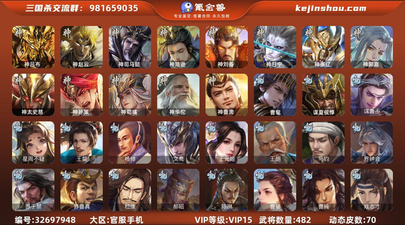 [17952885]标题:S36807 VIP等级: VIP15 官阶: 大将军 武将数量: 482 动态皮肤数量: 71 国战武将:98 史诗武将数量:97 史诗宝珠数量:0 将魂数量:1678 雁翎数量:24377 心愿积分:11582 神将: 神甘宁,神郭嘉,神刘备,神陆逊,神吕布,神司马懿,神孙策,神太史慈,神荀彧,神张辽,神赵云,神鲁肃,神华佗 魏国武将: 戏志才,曹纯,曹婴,陈琳,程昱,郝昭,嵇康,界曹真,界于禁,界钟会,马钧,魏-司马昭,王朗,王元姬,文鸯,杨修,王粲,星周不疑,蒋干,谋曹丕,谋夏侯惇,曹髦,清河公主,势董昭 蜀国武将: 董允,关索,花鬘,界黄忠,谯周,沙摩柯,王平,张星彩,赵襄,周群,诸葛瞻,谋马超,谋赵云,谋夏侯氏,谋黄忠,马云騄,谋诸葛亮,谋关羽 吴国武将: 贺齐,界步练师,界徐盛,界朱然,留赞,骆统,孙寒华,周处,文鸯,谋黄盖,谋陆逊,张奋,势太史慈 群国武将: 杜预,公孙康,界李儒,界左慈,沮授,刘焉,祢衡,南华老仙,麹义,审配,苏飞,陶谦,兀突骨,星黄忠,许攸,杨彪,张琪瑛,张让,张仲景,郑玄,左慈,皇甫嵩,界沮授,谋张角,裴秀,谋貂蝉,十常侍,谋公孙瓒,群-司马昭,星董卓,友诸葛亮