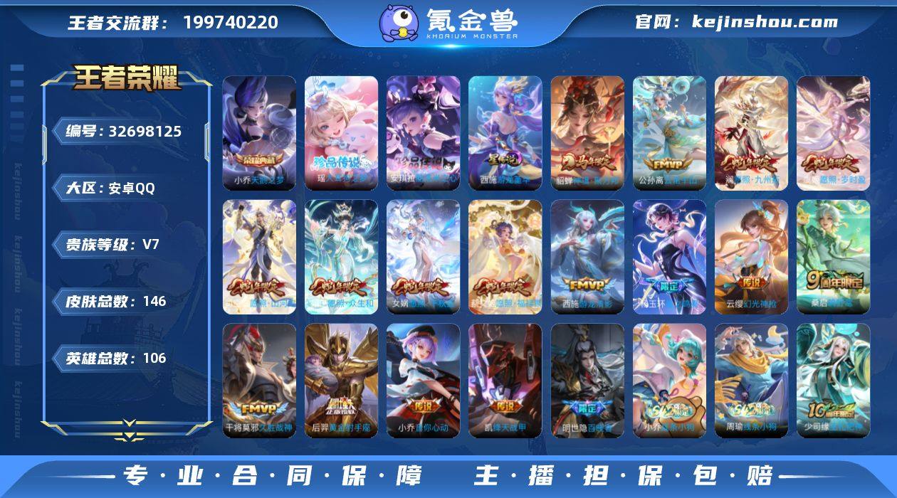 【Ewz517】【精品女号,蛇限全套 瑶大耳狗,小乔典藏,安琪拉库洛米,7个性按键,秒换绑】 ,安卓Q-V7-最强王者段位-106英雄-146皮肤-1典藏皮肤-2珍品传说-16传说-38史诗 【英雄全皮】:孙权全皮,影全皮 【荣耀典藏】:小乔天鹅之梦 【珍品传说】:安琪拉酷洛米之心,瑶大耳狗之梦 【传说皮肤】:貂蝉神骥聚万邦,公孙离云诺千山,杨玉环星之鸣奏,司空震愿照山河定,女娲愿照千秋盛,妲己愿照众生和,澜愿照九州拓,蔡文姬愿照福禄聚,虞姬愿照岁时盈,云缨幻光神枪,桑启鸣野蒿,西施游龙清影,小乔音你心动,铠绛天战甲,干将莫邪久胜战神,后羿黄金射手座 【限定皮肤】:狄仁杰阴阳师,赵云皇家上将,孙尚香蔷薇恋人,元歌无心,狄仁杰魔术师,项羽海滩派对,关羽百相守梦,米莱狄胡桃异想国,上官婉儿神器万象笔,蒙犽狂想玩偶喵,阿古朵江河有灵,妲己灵卜魔法,安琪拉乘龙聚宝船,李元芳蔬乡物语 【年限皮肤】:安琪拉乘龙聚宝船,司空震愿照山河定,女娲愿照千秋盛,妲己愿照众生和,澜愿照九州拓,蔡文姬愿照福禄聚,虞姬愿照岁时盈 【赛季限定】:东皇太一噬灭天穹,太乙真人谧流熔炉,钟馗虚灵犬护,亚瑟荣光之誓 【战令限定】:蒙犽狂想玩偶喵,米莱狄胡桃异想国...