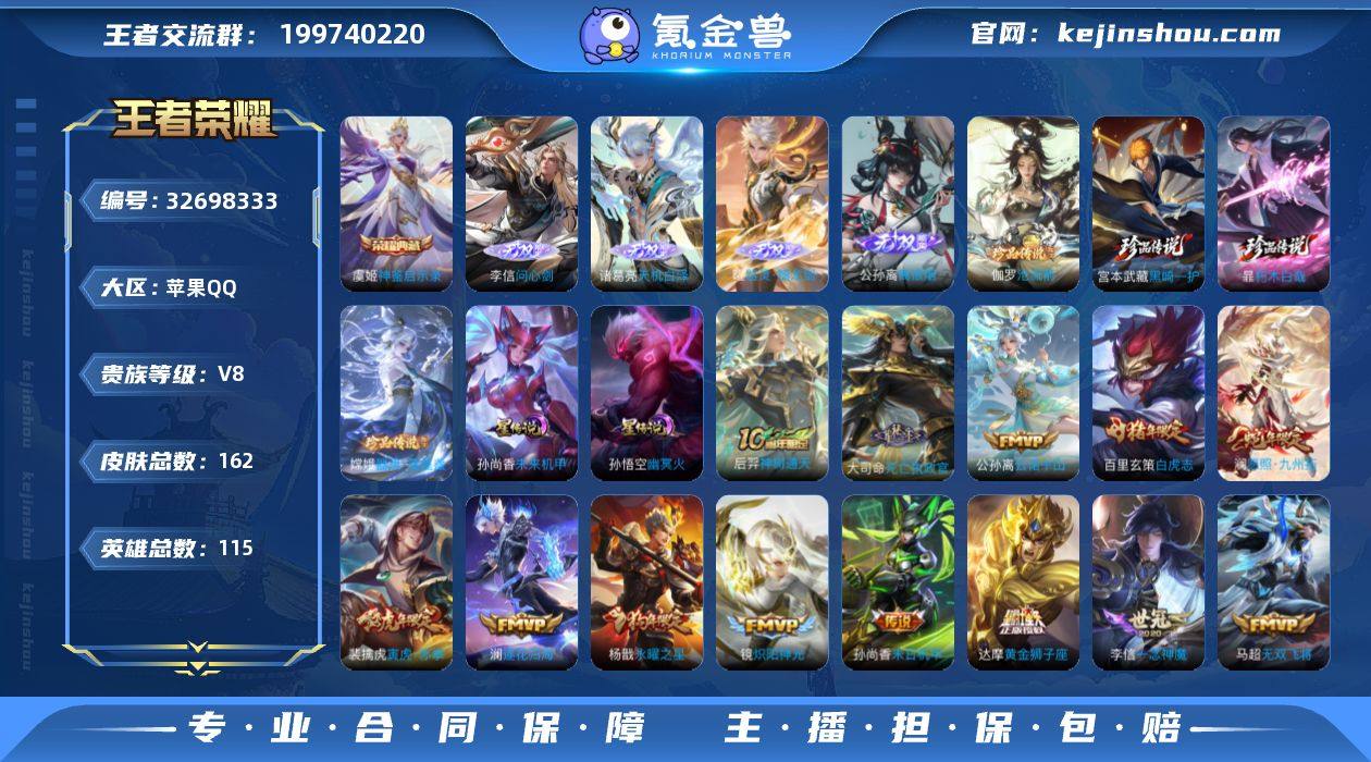 【Ewz537】【1典藏+4无双+4珍品传说,差3999点卷到V9,37个性按键,秒换绑】苹果Q-V8-最强王者段位-115英雄-162皮肤-1典藏皮肤-4无双-4珍品传说-26传说-47史诗 【英雄全皮】:孙权全皮,苍全皮,大司命全皮,敖隐全皮,澜全皮,空空儿全皮,影全皮 【荣耀典藏】:虞姬神鉴启示录 【无双皮肤】:李信问心剑,诸葛亮天机白泽,曜器灵螭龙剑,公孙离离恨烟 【珍品传说】:伽罗沧流箭,宫本武藏黑崎一护,暃朽木白哉,嫦娥器灵落星盏 【传说皮肤】:后羿神树通天,大司命死亡执政官,公孙离云诺千山,澜愿照九州拓,裴擒虎祥瑞亨通,桑启鸣野蒿,澜逐花归海,诸葛亮鹤羽星尊,澜电玩雷克斯,李白诗剑行,百里守约碎云,马超无双飞将,裴擒虎寅虎赤拳,李元芳飞鸢探春,铠绛天战甲,镜炽阳神光,虞姬启明星使,李信一念神魔,刘备时之恋人,达摩黄金狮子座,百里玄策白虎志,杨戬永曜之星,貂蝉仲夏夜之梦,孙尚香末日机甲,孙悟空地狱火,狄仁杰超时空战士 【限定皮肤】:公孙离离恨烟,狄仁杰阴阳师,赵云皇家上将,嬴政优雅恋人,元歌云间偶戏,狄仁杰魔术师,项羽海滩派对,虞姬启明星使,杨戬永曜之星,诸葛亮鹤羽星尊,百里玄策白虎志,沈梦溪大漠名商,裴擒虎寅虎赤拳,嫦娥...
