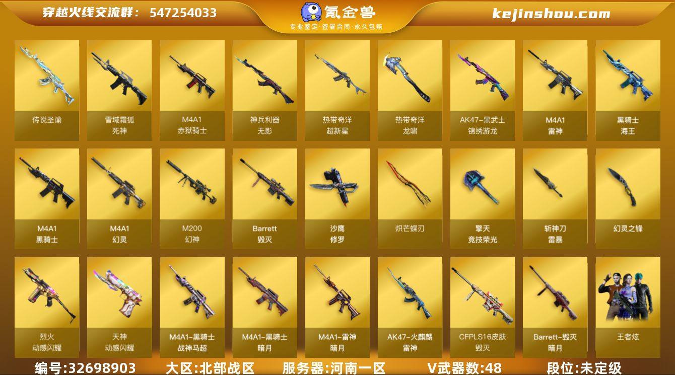 河南一区-53V-8王者-0炫金 【传说武器】:传说圣谕 【热门武器】:传说圣谕,M200-幻神,M4A1-黑骑士,沙鹰-修罗,炽芒蝶刃,炽芒蝶刃-破浪逐光 皮肤 【音效卡】:M4A1-黑骑士音效卡,Barrett-碧霄极光音效卡,炼狱-百战金芒-庆典舞曲音效卡,死神-雪域霜狐-怀旧音效卡 【皮肤】:幻神-电竞之星 皮肤,Kar98K-星神-AG-CFPLS21冠军皮肤,雷神-暗月,M4A1-再燃火线,火麒麟-雷神,毁灭-暗月,毁灭-SV-CFPLS16冠军,毁灭-英雄计划 皮肤,黑骑士-暗月,黑骑士-战神马超,黑骑士-破界 皮肤,修罗-星空,轻型军用手斧-再燃火线,炽芒蝶刃-破浪逐光 皮肤 【角色】:隼,审判者,战地猎狐,王者炫,雪域霜狐,奇洋探员,乔伊教练,暗夜-X,初恋灵狐,电竞少女,芳心审判者,飞虎队-X,风暴女,嘉年华灵狐,娟娟,兰-海滩派对,猎狐者-追月,0号玩家,零-水下丽影,灵狐者-X,龙儿,龙儿-小淘气,麻雀,曼陀罗-X,潘多拉-X,潘多拉-甜心教官,青霞仙子,蛇姬,兔囡囡,新娜塔莎,樱-战斗天使,影武者-X,游珑儿 【人偶武器】:星神-炽天使,巴雷特-零-水下丽影,加特林-机械猎手,AWM-灵狐-15周年嘉年华,迷你牛牛*2,迷你生化手雷,生化手雷-机甲核心*3,深渊终结者手雷,Barrett-夜玫...