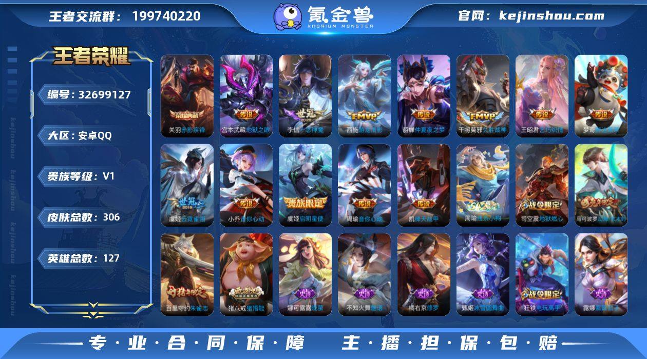 安卓Q-V0-至尊星耀V段位-127英雄-306皮肤-1典藏皮肤-1典藏英雄-12传说-86史诗 【英雄全皮】:孙权全皮,猪八戒全皮 【荣耀典藏】:武则天英雄,关羽赤影疾锋 【传说皮肤】:王昭君乞巧织情,西施游龙清影,周瑜音你心动,小乔音你心动,铠绛天战甲,虞姬启明星使,李信一念神魔,干将莫邪久胜战神,虞姬云霓雀翎,梦奇胖达荣荣,貂蝉仲夏夜之梦,宫本武藏地狱之眼 【限定皮肤】:白起狰,狄仁杰阴阳师,虞姬凯尔特女王,赵云皇家上将,墨子神迹守卫,庄周云端筑梦师,庄周高山流水,高渐离玩趣恶龙,钟无艳超时空战士,孙膑妖精王,扁鹊炼金王,芈月重明,芈月幻夜卜梦,元歌无心,夏侯惇朔风刀,甄姬落雪兰心,曹操烛龙,典韦穷奇,马可波罗山海玄木吟,狄仁杰魔术师,狄仁杰万华元夜,达摩沙漠行僧,项羽海滩派对,老夫子醍醐杖,老夫子航海奇遇记,程咬金演武夺筹,王昭君午后时光,兰陵王金庭之子,孙悟空美猴王,牛魔御旌,李元芳匿光侦查者,李元芳云中旅人,虞姬启明星使,钟馗驱傩正仪,杨玉环遇见飞天,杨戬潮玩骑兵,雅典娜单词大作战,太乙真人饕餮,鬼谷子原初探秘者,鬼谷子五谷丰年,黄忠火炮绅士,百里守约朱雀志,弈星混沌棋,梦奇顽趣,沈梦溪大漠名商,明世...